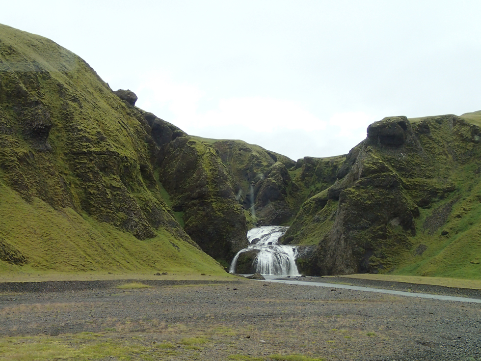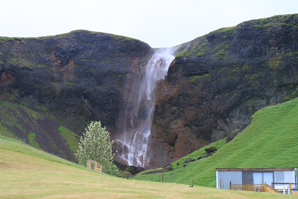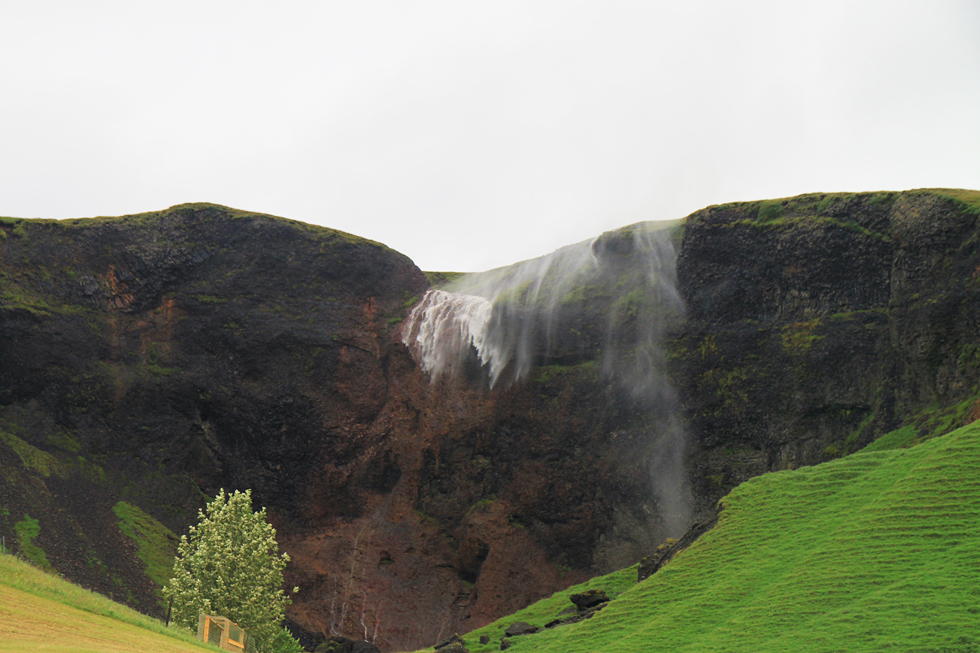 Два года назад мы проезжали здесь в песчаную бурю, возвращаясь из парка Скафтафетль. С изумлением увидели тогда водопад, текущий вверх, но из окна автобуса сфотографировать его, конечно, не успели.