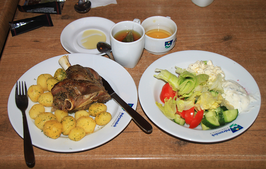 В Хусадалур примчались в 18:50. Я вспомнила, что в 19:00 у них в кафе есть ужин — и точно, есть, стоит 4500 крон. Как будто специально для нас его перенесли на полчаса попозже, и мы успели поставить палатку. Дороговато, но мы решили разориться. И действительно, ужин был богатый — много составляющих для салата, баранина с картошкой, чай с кексиком, при этом подход не ограничен — то, что надо после 33 км под рюкзаком.