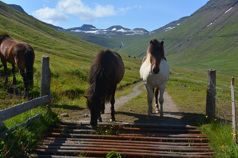А когда мы выходили из долины, к нам поспешили те лошадки, которые валялись на лугу. Их останавливают вот такие трубы на дороге, дальше они идти не могут. Поэтому частные владения имеют какое-то ограждение вдоль лужайки и такой ряд труб на общей проезжей дороге.