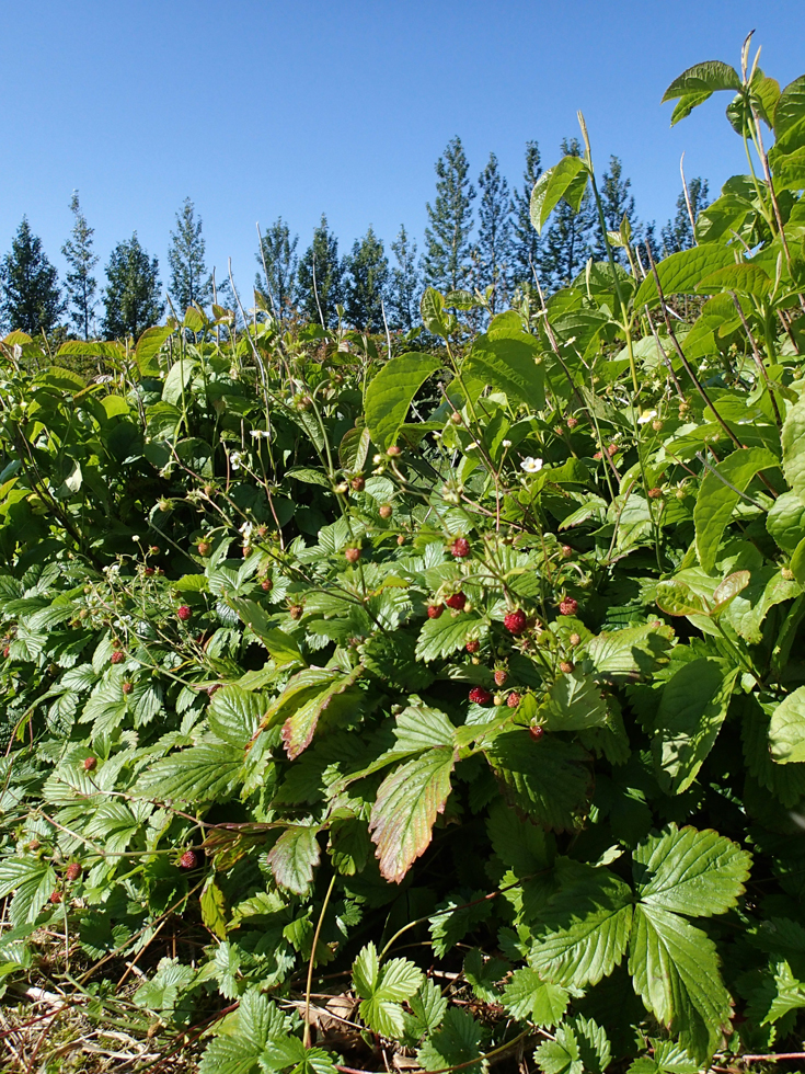 Тропинка из леса заворачивает в городской сад-питомник. Там и кустарники разные, и деревья. И земляника вот поспела к середине августа.