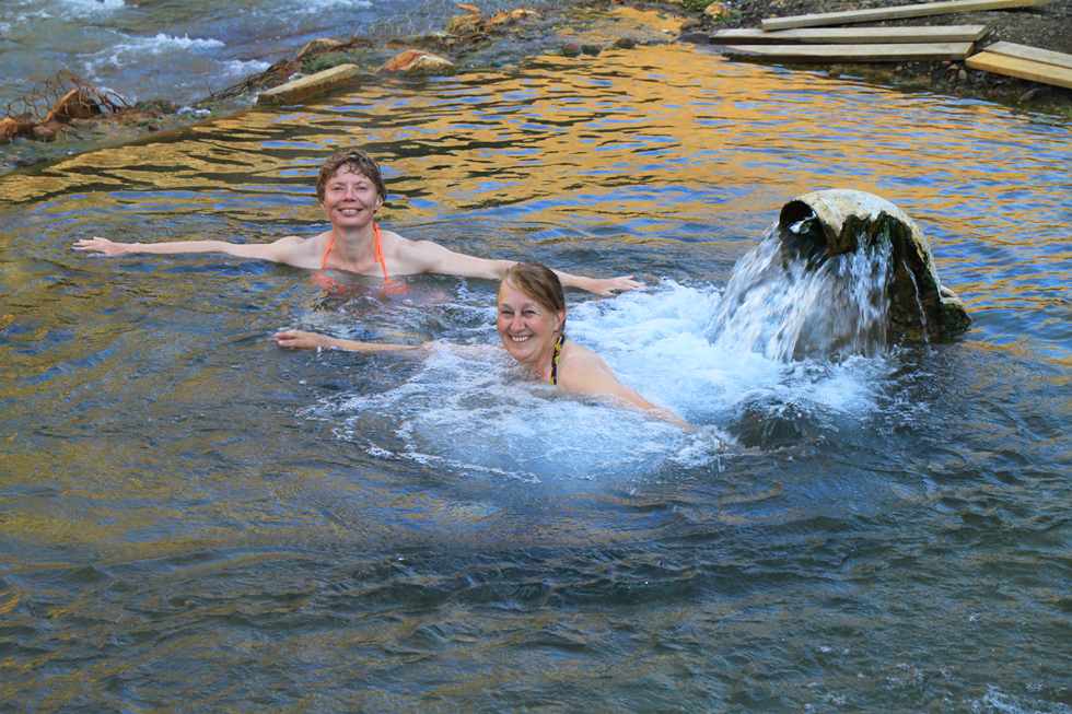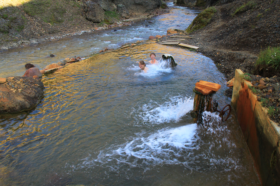 В реке вода холодная, в бассейне 35–36 градусов примерно, возле труб теплее. Вода сильно пахнет ржавчиной, но это, скорее всего, не в трубах дело, а в местных горных породах: вся река от ржавчины золотистая, тут просто много железа.