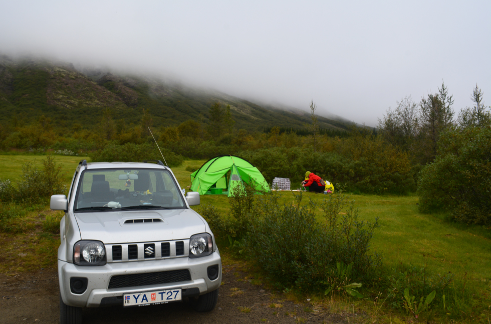 Уезжали мы поздно, так что в кемпинг Лойгарватна попали уже на закате. По дороге Ослик попытался барахлить: что-то внутри стучало. Мы пугались, останавливались, осматривали колеса... все ровно. Было страшновато, потому что никто из нас в строении машины особо не разбирается. Видимо, стучал то ли двигатель, то ли переключатель... ээээ... между полным и неполным приводом не очень хорошо переключился. Вобщем, Ослик нас пугал некоторое время, а потом устыдился и перестал стучать. Так мы и не поняли, что это было.