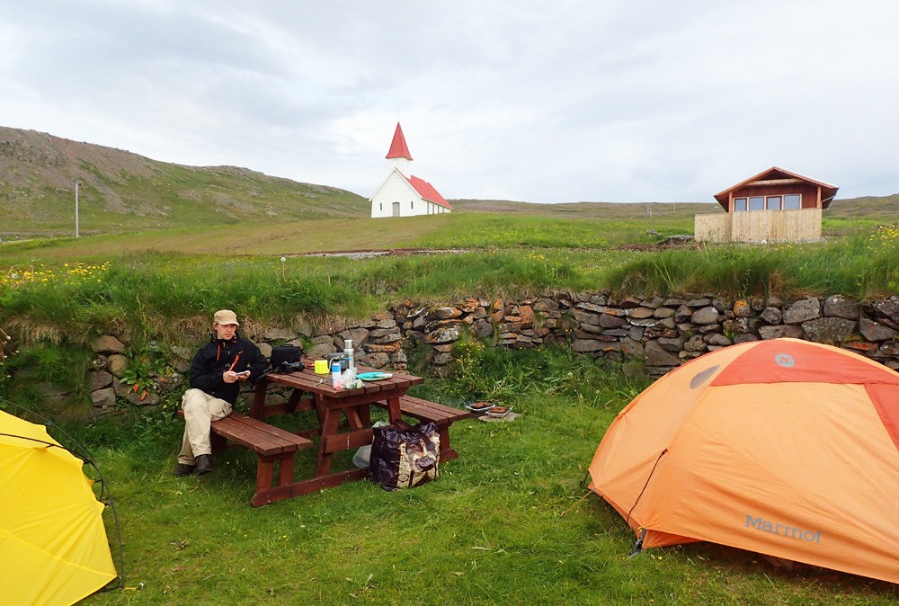 Остановились мы в кемпинге Брейдавика. Помнили по прошлой поездке, какой он хороший. Тут можно поставить палатки вот в такие «комнатки». Не знаю, была ли у них когда-нибудь крыша.