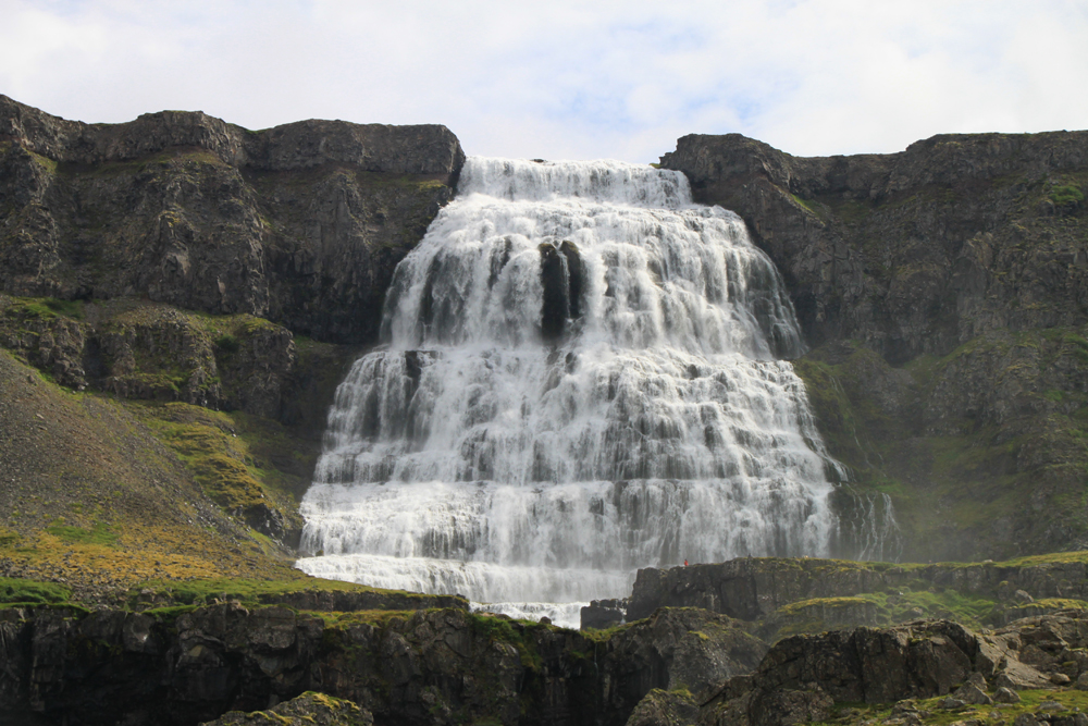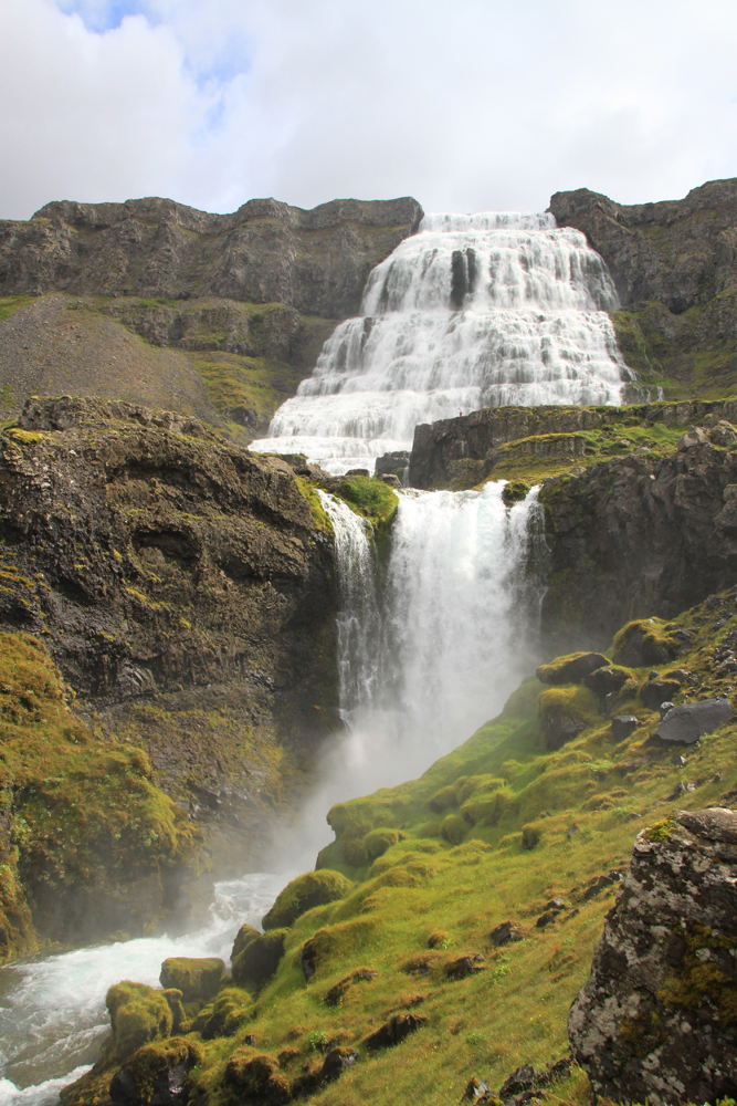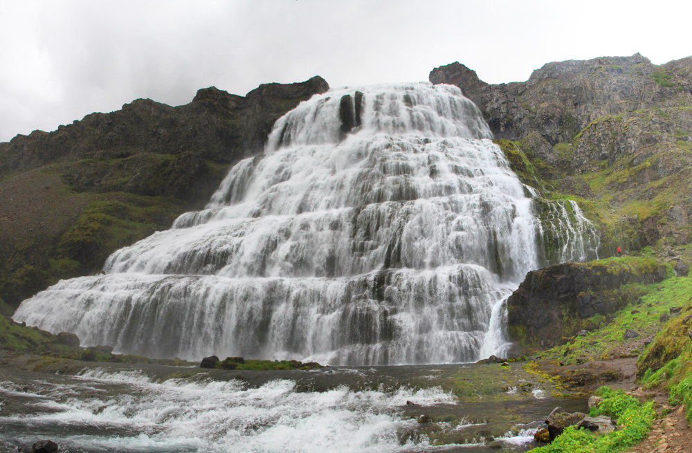 Я залезла наверх, постояла в качестве фотомодели под горизонтальным водопадным дождем, хороший гортекс там строго обязателен. А иначе не понять, какой же он огромный. Во-о-он та маленькая красная точка справа — это я, а водопад 190 метров в высоту и в ширину.