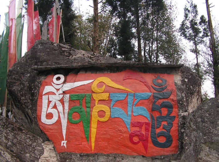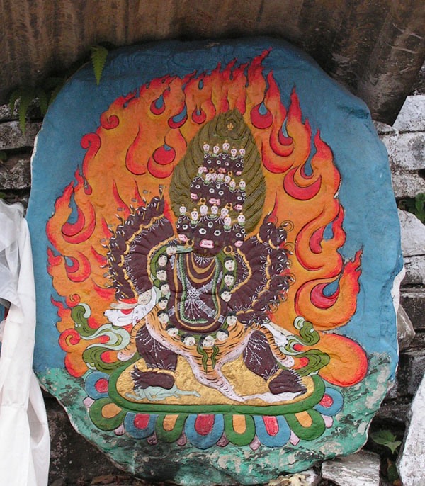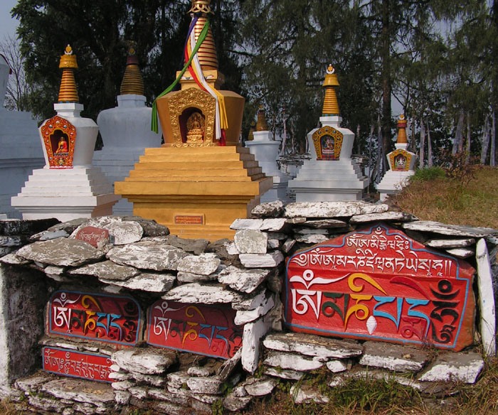 Вокруг монастыря множество камней, на который выбиты мантры и изображения будд и боддхисаттв. И вообще там есть традиция: можно купить каменную табличку с мантрой, посвятить ее близкому человеку и поставить рядом с другими такими же. Со временем старые таблички складывают и закрашивают побелкой, и они становятся стеной, к которой прислоняются новые таблички.