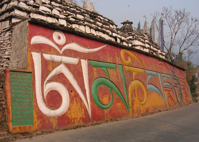 А это стена с мантрой в самой деревне: буквы высотой три с лишним метра: