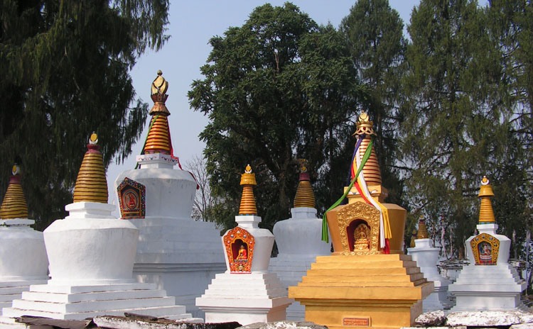 Рядом с большой ступой построили много маленьких и получился «лес ступ». В лучах утреннего солнца выглядит очень красочно, там тихо и никто не беспокоит. Очень приятное место.