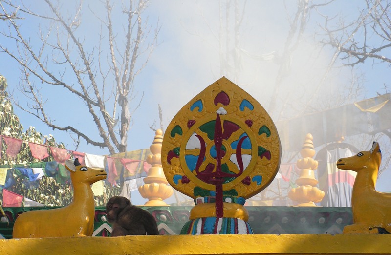— храмы. Вот это храм Махакалы, почитаемый двумя религиями. О чем свидетельствует колесо с трезубцем над входом.