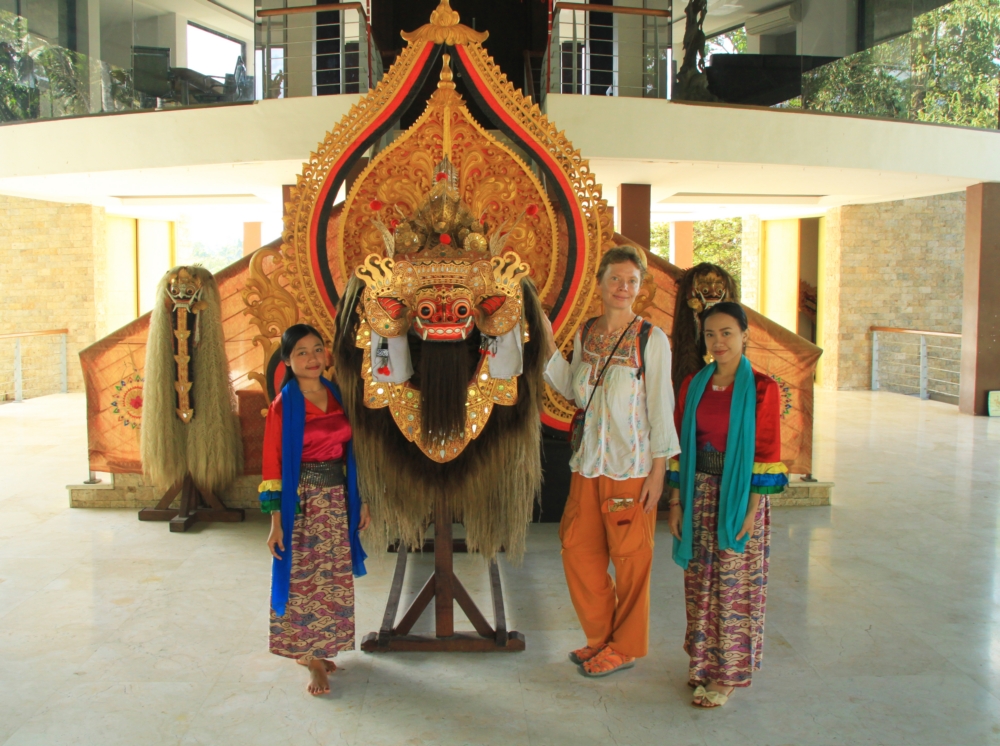 На входе всех посетителей встречают с танцами. Я потом попросила девушек сфотографироваться вместе с Баронгом — это такое мифическое существо, участвующее в балийских представлениях и ритуальных шествиях.