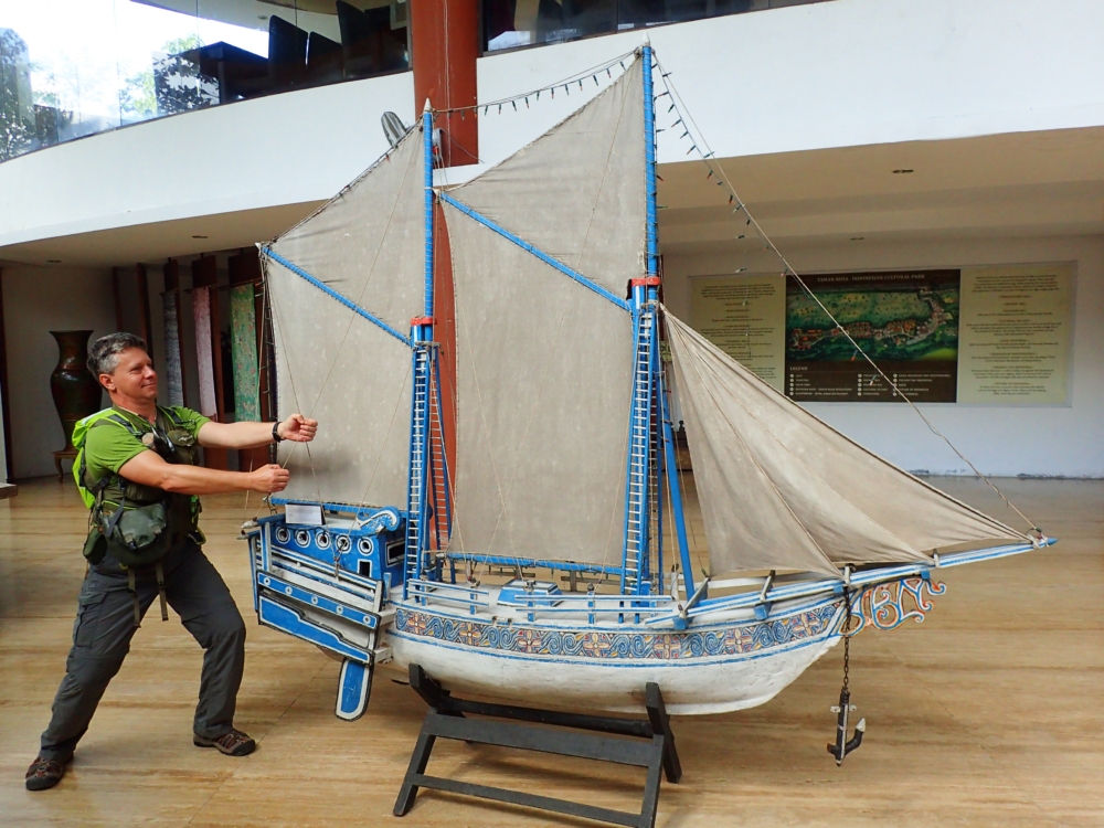 Есть музейная часть с образцами ткани, куклами и разными моделями. Ран тянет шкот у кораблика с Суматры.
