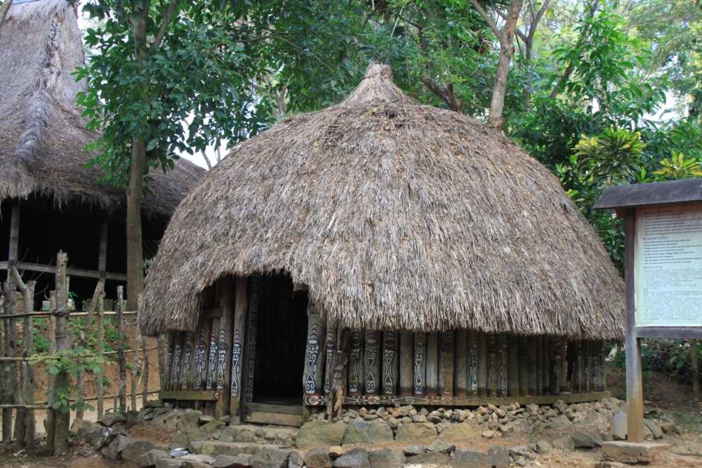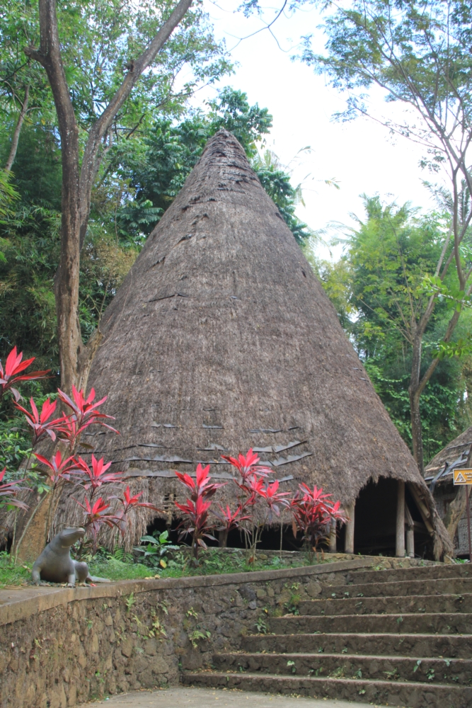 У Индонезии очень много островов с абсолютно разной материальной культурой. Дома в парке настолько удивительных форм, что возникает впечатление, будто пришел в гости к инопланетянам. Вот ведь зачем-то нужна такая огромная крыша этому в сущности небольшому дому с острова Сулавеси.
