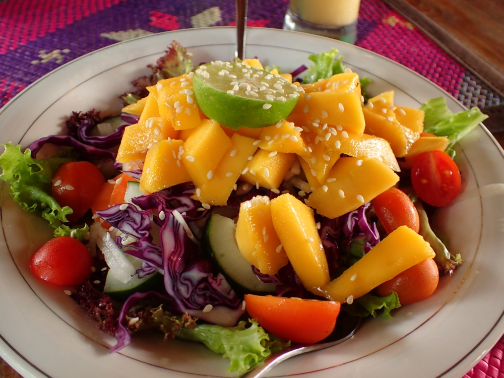 К нему мы взяли овощной салат, в который положили сверху манго и кунжут. Приятно разнообразит вкус.
