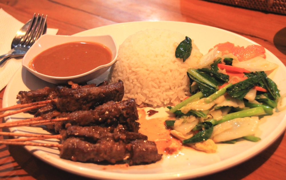 Оформление будет из банановых листьев, в качестве мяса тут намотанный на палочку и поджаренный куриный фарш. Довольно часто в тарелку кладут рисовые вздутые чипсы (справа сверху). Соус не очень острый.