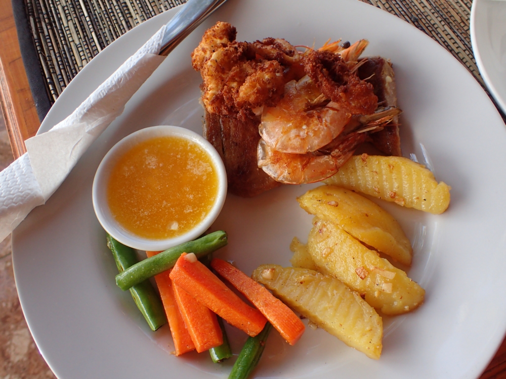 И даже морепродукты принято жарить как следует. Креветки и рыба тут еще ничего, а вот кальмар превратился в угольки.