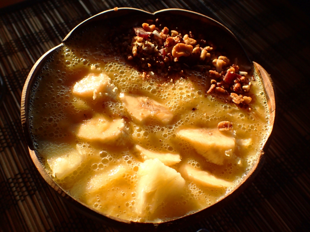 Из манго всё это делается так: одно спелое манго (в Москве они теперь есть во Вкусвилле, ура!), половинка банана и 150–200 граммов ананаса режутся на мелкие куски. Четверть оставляется в кусках, остальное надо размолоть с некоторым количеством льда по вкусу. Смузи наливается в чашу, сверху кладутся кусочки фруктов и какая-нибудь вкусная мелочь типа орехов или гранолы. О, это песня!