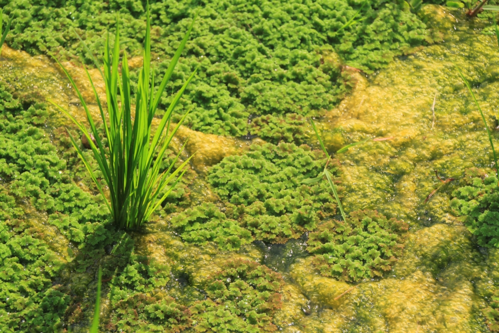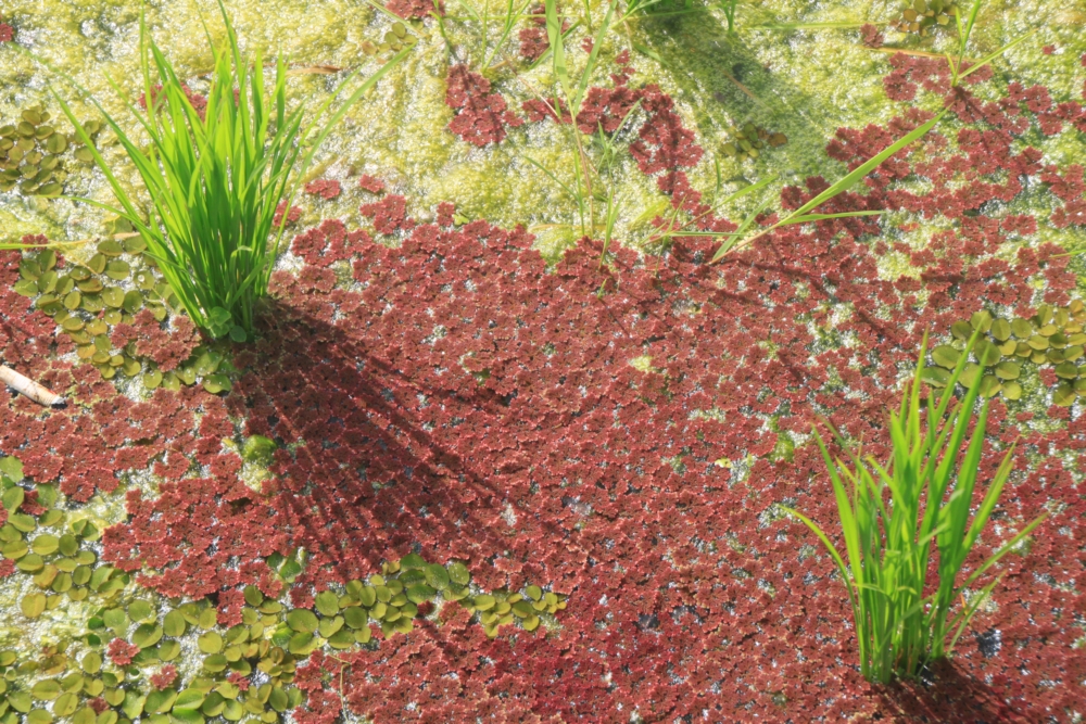 Тут между рисовыми кустиками на воде выросли водоросли.