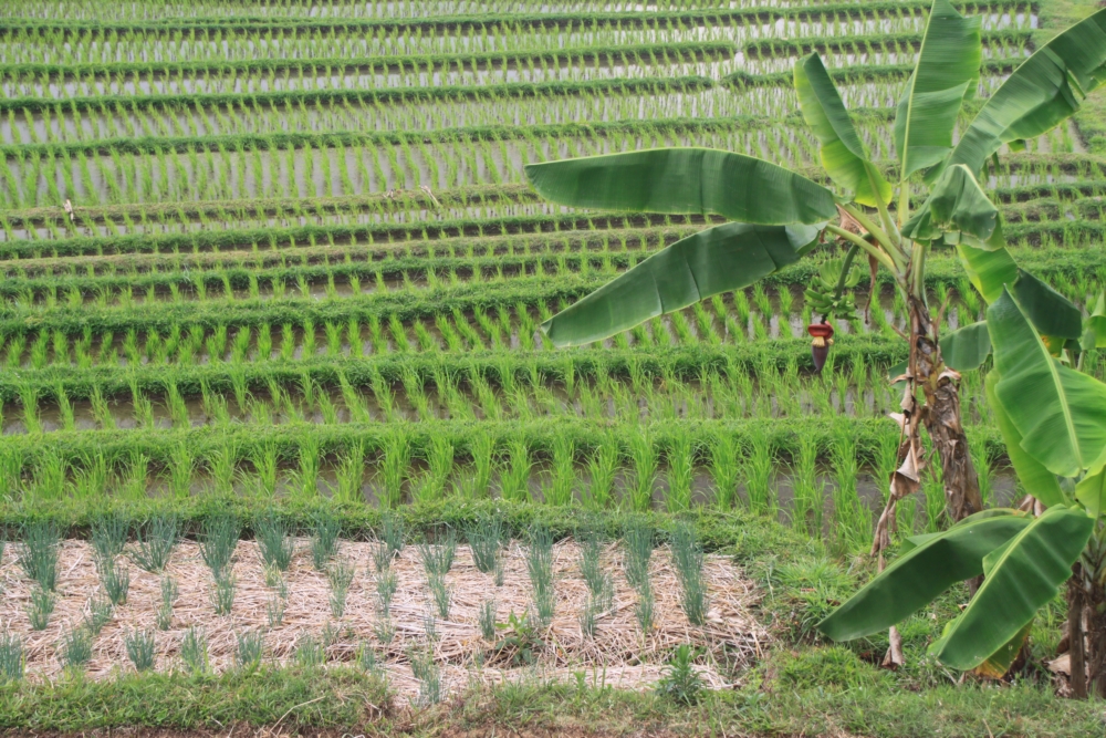 Тут на переднем плане растет лук и бананы, а рис их выгодно оттеняет :-)