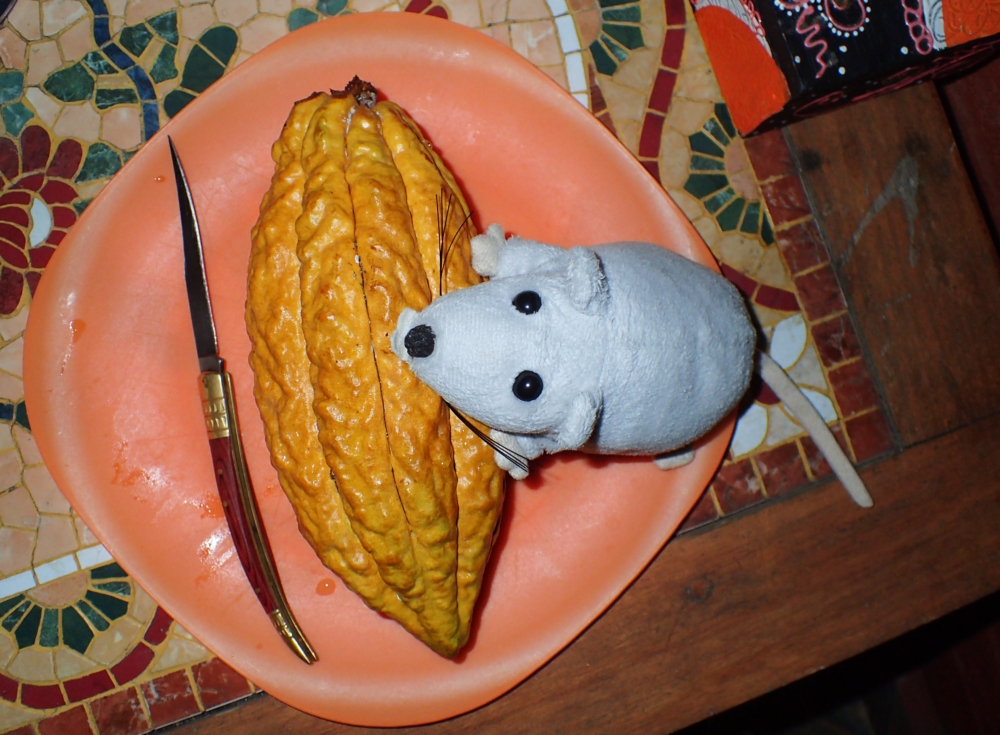 Внутри оказалось 50 с лишним какао-бобов. Сладкую мякоть мы съели, плоды кое-как очистили от шкурки и в таком виде сушили до приезда в Москву.