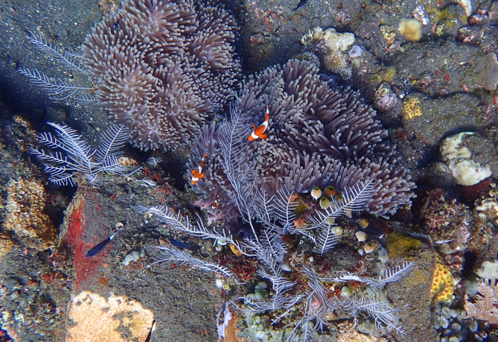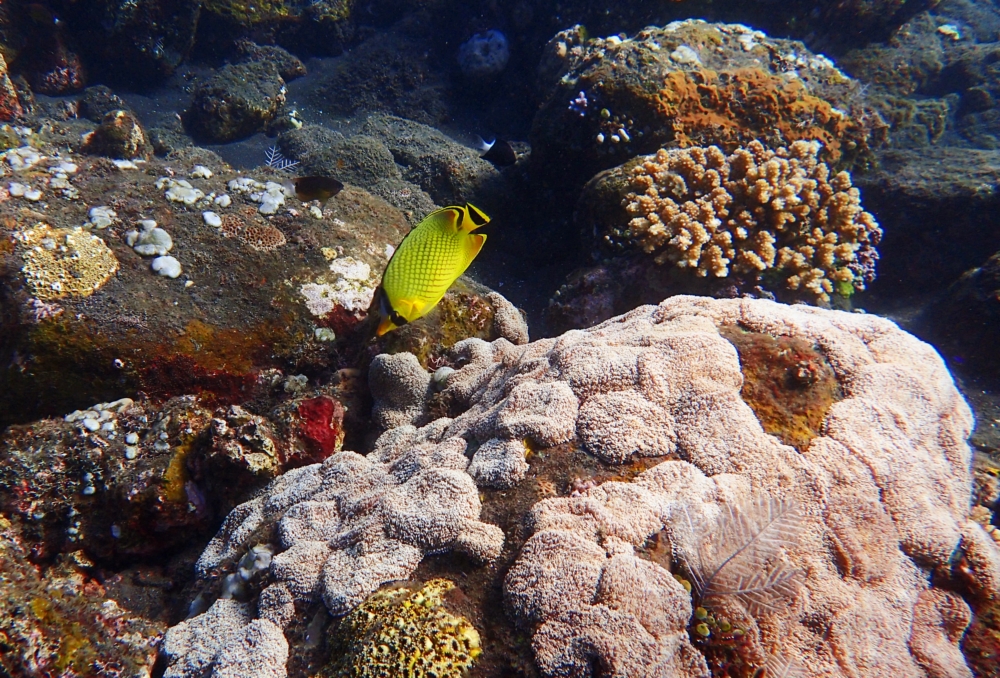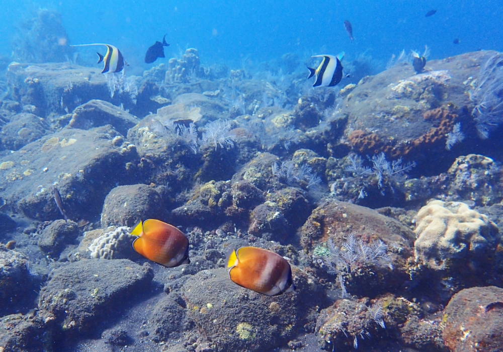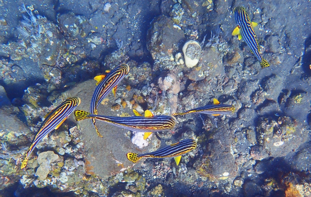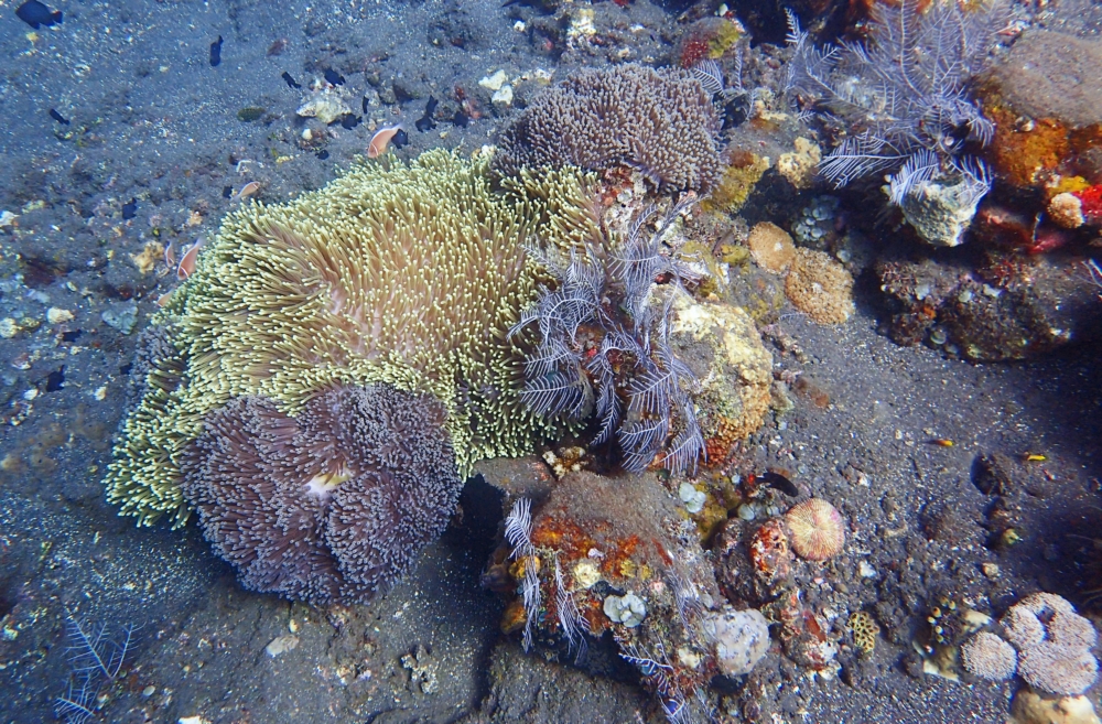 Тут есть и рыбки, и заявленные кораллы, растущие на черном вулканическом песке.