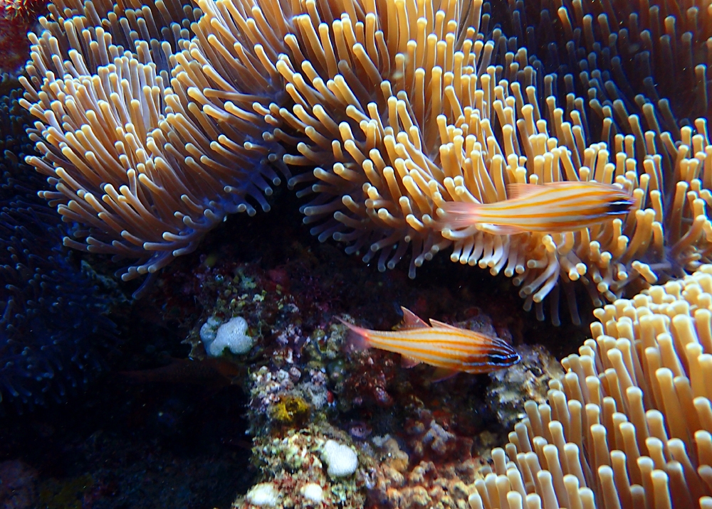 Рыбки прячутся в мягких кораллах, составляя с ними симбиоз.