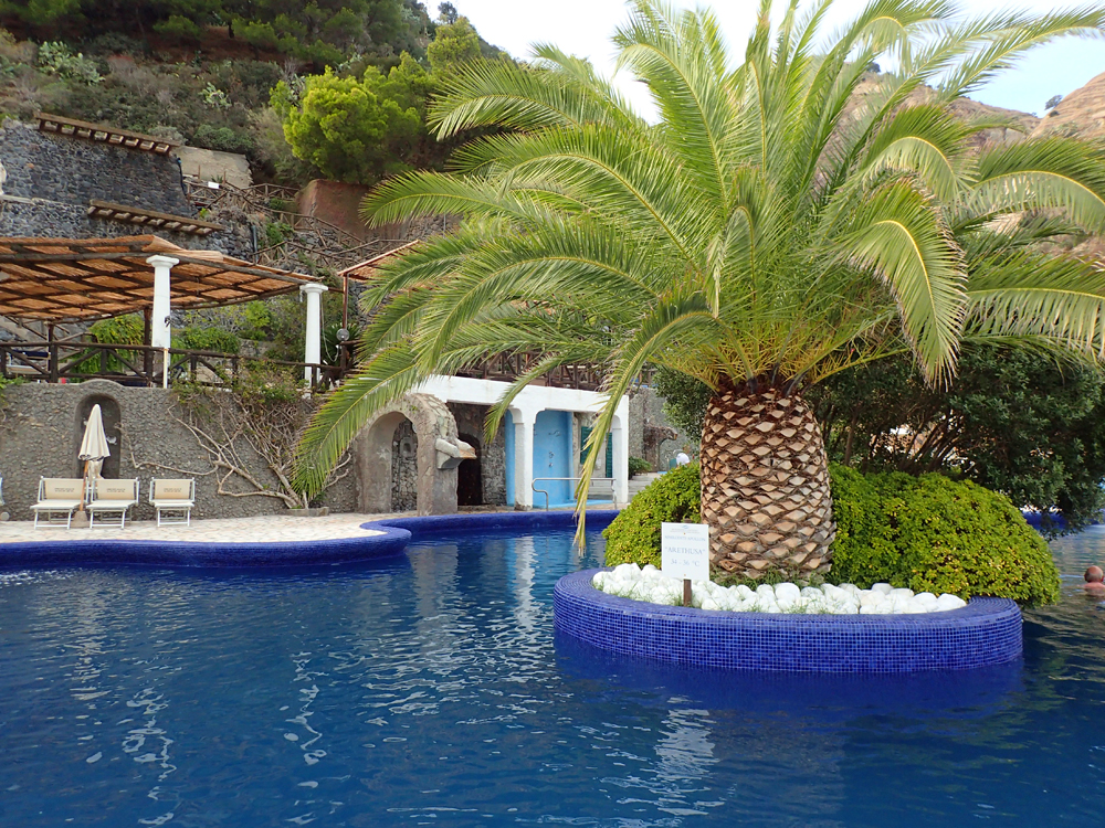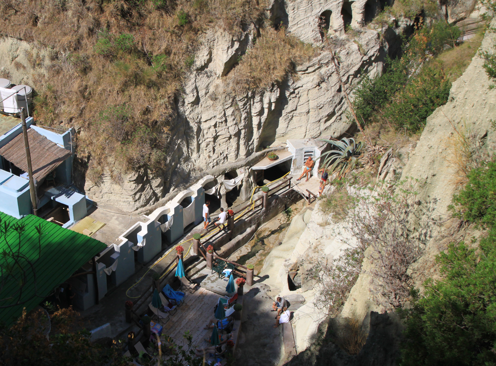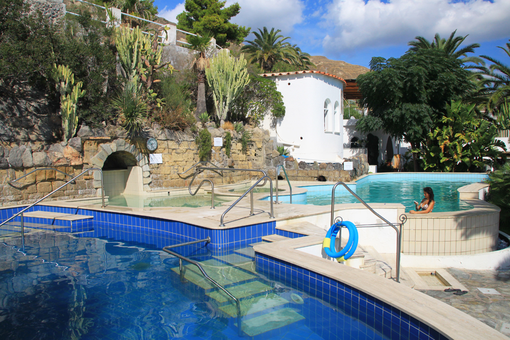 Купаться мы решили в термальном парке Афродита-Аполлон. Немного не доходя до парка видели Фумароле — на пляже есть область горячего песка, из него идет пар. Еще в автобусе кто-то из русских сказал нам, что в этот песок иногда закапывают желающих ради пропекания прогревания организма. Но желающих мы не увидели.