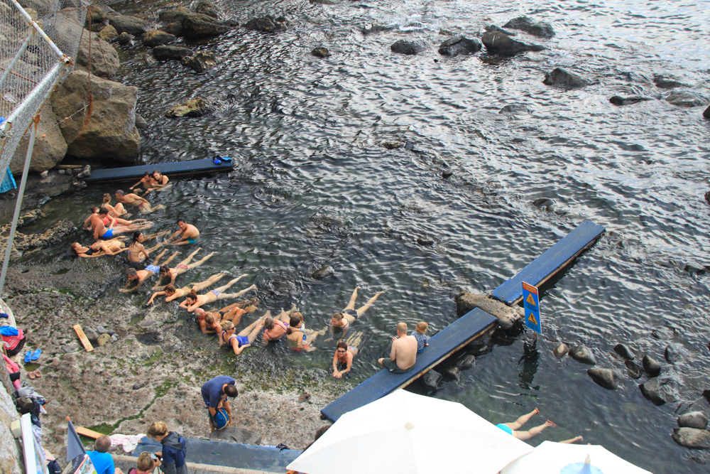 В Сорджето мы ездили еще раз, несколько дней спустя. Решили выяснить, что же там в углу бухты и поплыли туда. А там оказались тайные ванночки с горячей водой, о которых почти никто не знает. В них вода перемешивается сама и всё отлично, кроме сыпучих скал сверху. Скалы укреплены только в районе ресторана и основного места для купания. Возвращаясь, мы увидели надпись, что вроде как дальше было плавать опасно и никто ничего не гарантирует... Ну по крайней мере — опасно ходить по берегу, потому что на голову может что-то упасть.
