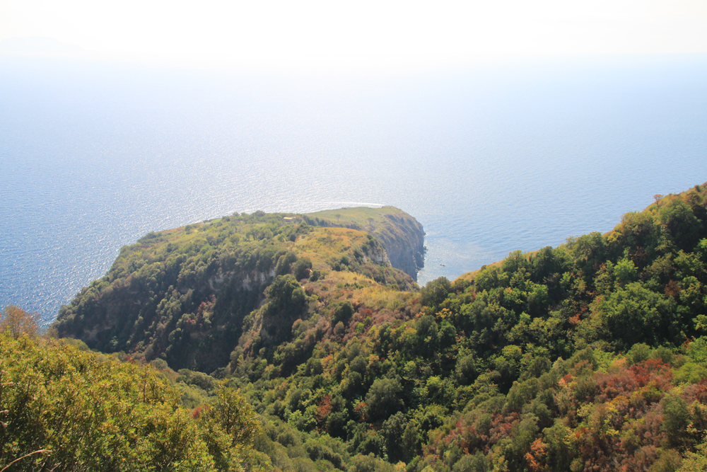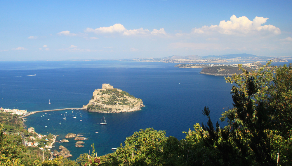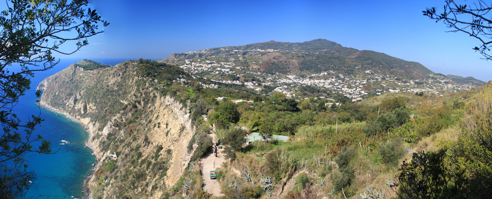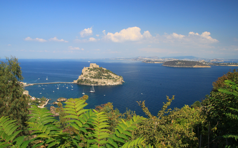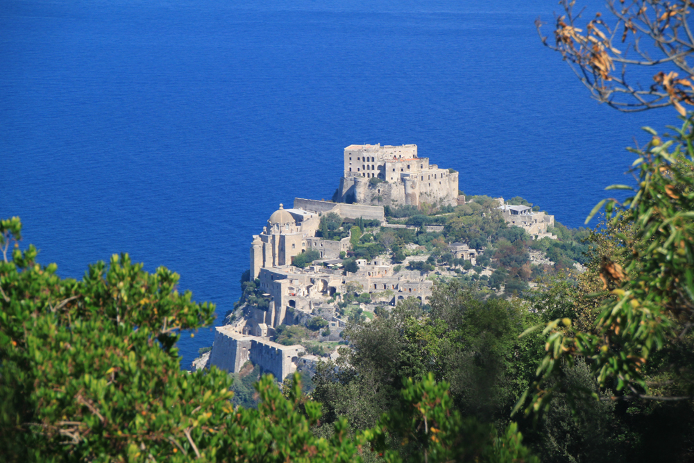 В самом поселке указатели звали нас спуститься вниз в какой-то ресторан, я возмутилась и воспротивилась, и мы полезли наверх, теряя дорогу. Залезли в чужой огород, с трудом из него вылезли, обходя изгородь. Но направление выбрано было правильно: дальше дорога идет по лесу, то и дело попадаются обзорные точки: слева виды на Искью, справа — на Арагонский замок.