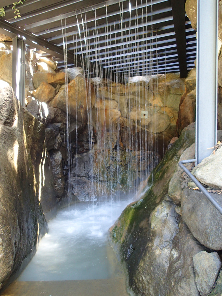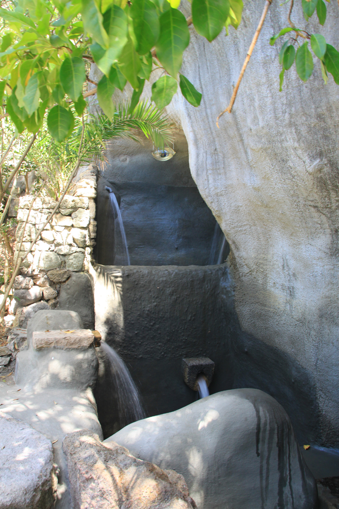 На дне круглые камешки, дорожек на самом деле две, надо переходить из одной в другую. В одной +15–+18, в другой +38–+40. Контрастные ванны для ног, совмещенные с массажем стоп.