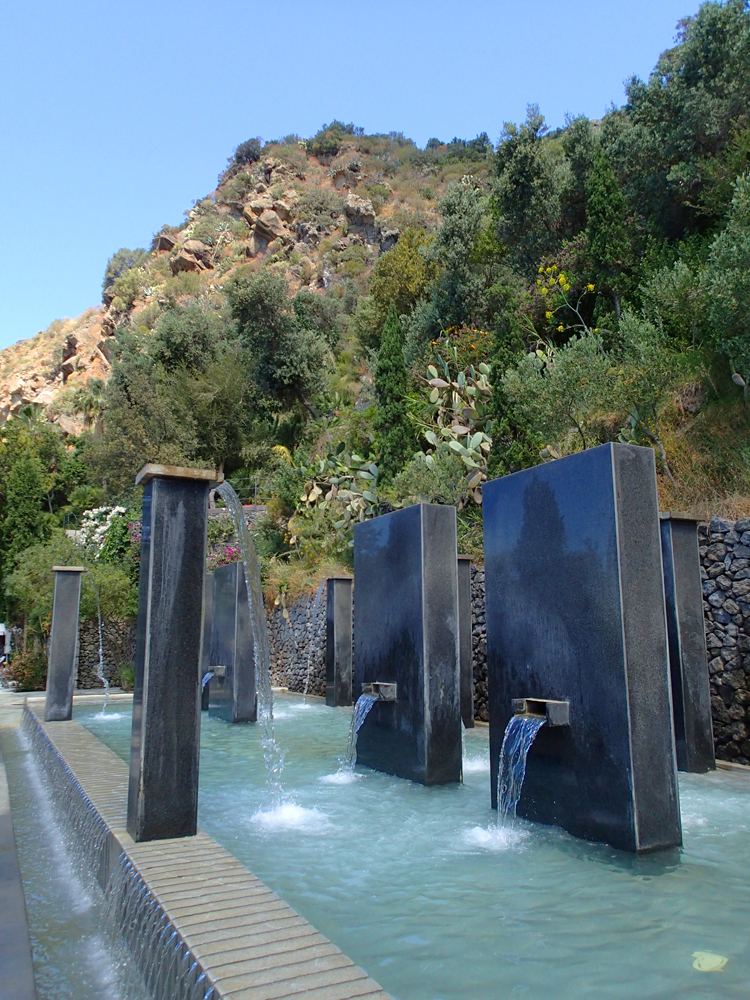 Мы начали знакомство с бассейнами сверху. Во всех вода солоноватая и с характерным запахом. Горячих бассейнов (так, чтобы вода была 38–40) 3-4 штуки, остальные 30–32–35, есть и «комнатной» температуры. В мае они были совершенно неактуальны, а вот летом в жару наверняка пользуются успехом.