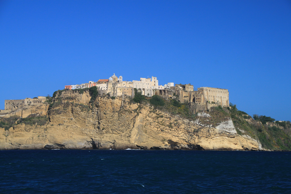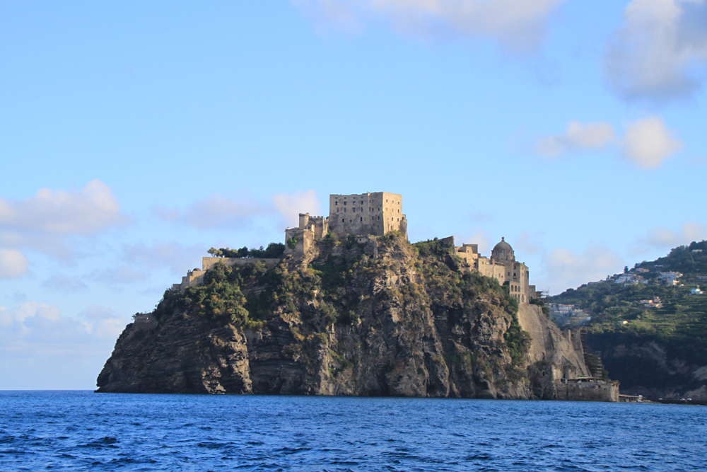 В полдень мы вышли из Сорренто и четыре часа шли под мотором на остров Искья. А там, возле Арагонского замка была мильная гонка вокруг буев. К ней я уже более-менее разобралась, что делать при повороте оверштаг, и в нужный момент тянула за нужные шкоты. Зашитый парус держал!