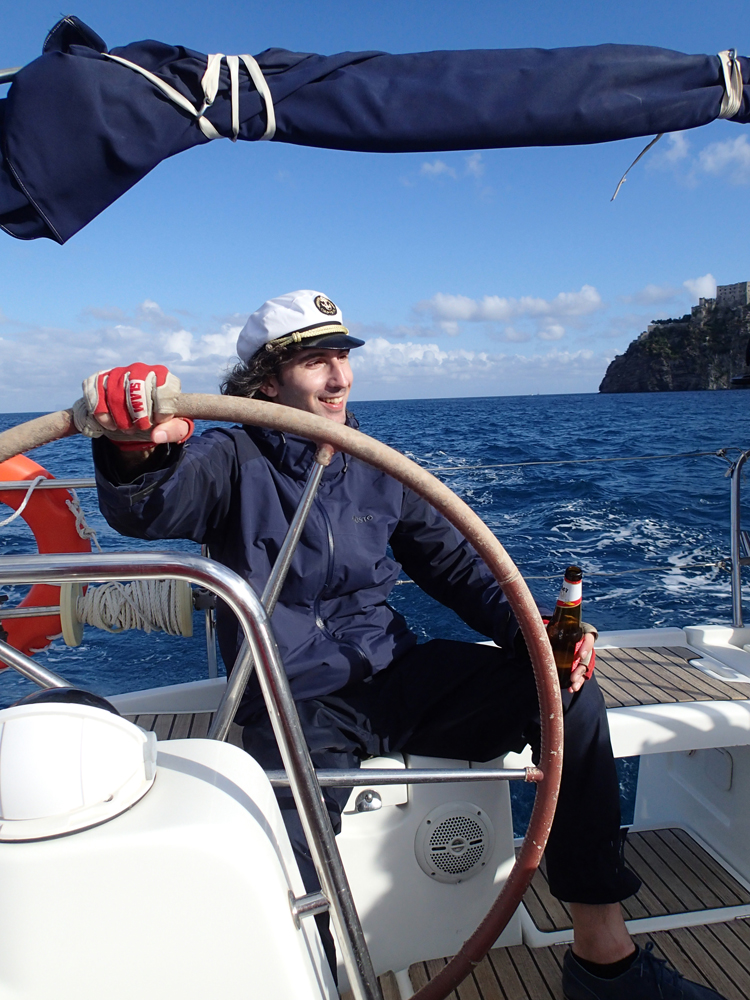 На Капри очень дорого куда-либо встать. В марину мы сами вставать не захотели, а к бую нам пришвартоваться не давали. Я попыталась зашить парус в море, но это было медленно и довольно экстремально, сильно мотало. На ходу парус вынуть из мачты мы не смогли, поэтому шить приходилось стоя, пристегнувшись к мачте. Мы понимали, что не успеваем.