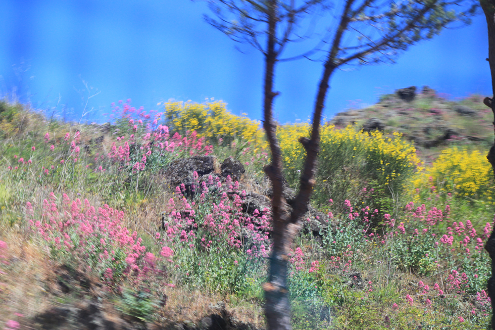 Склоны вулкана все были покрыты веселыми цветами. Из окна автобуса фотографировать было не очень удобно, но я пыталась.