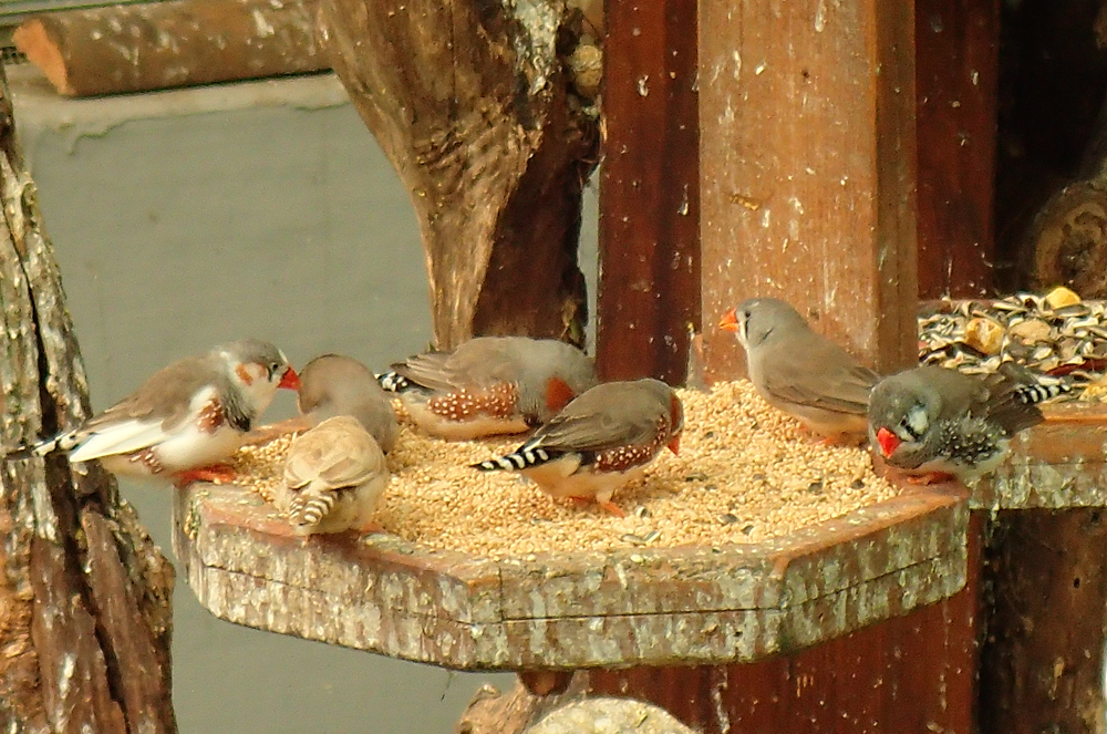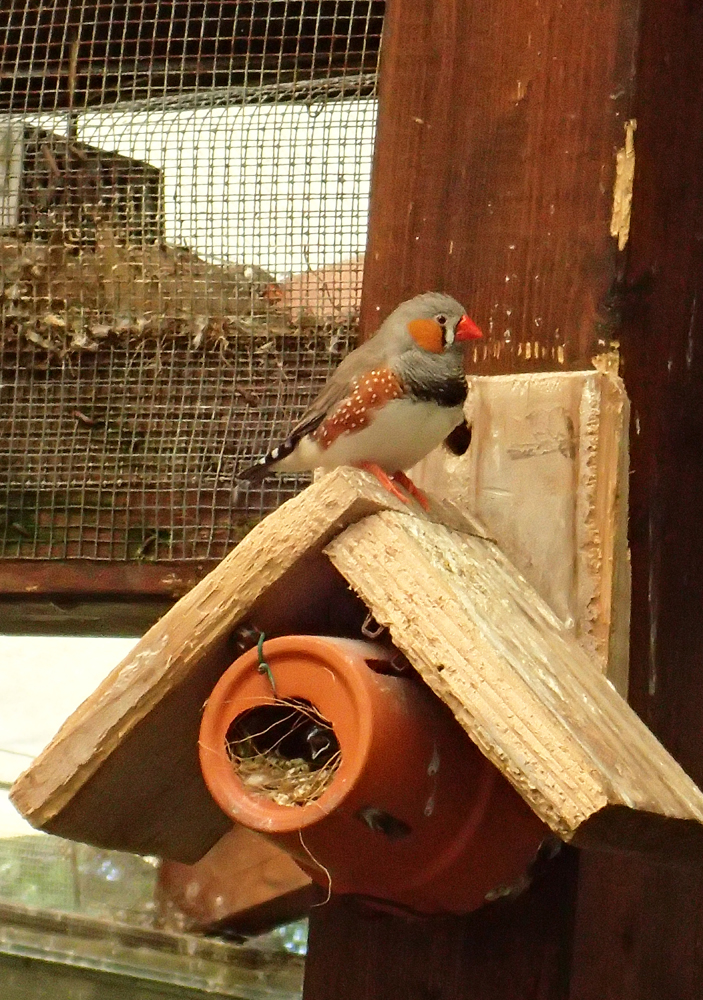 А еще есть птичий вольер. Там живут попугайчики и вот такие яркие маленькие птички.