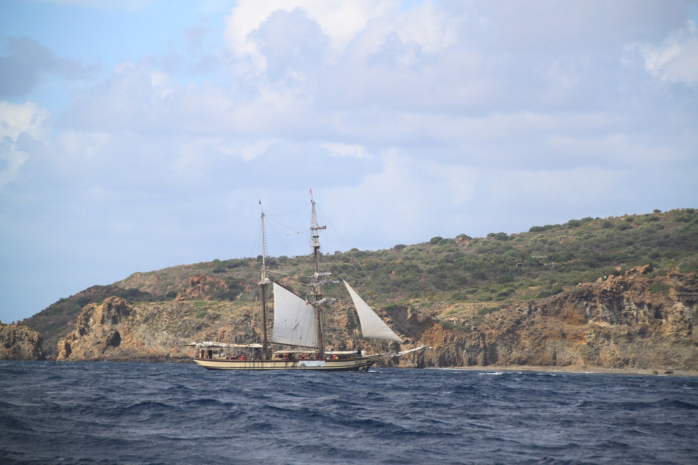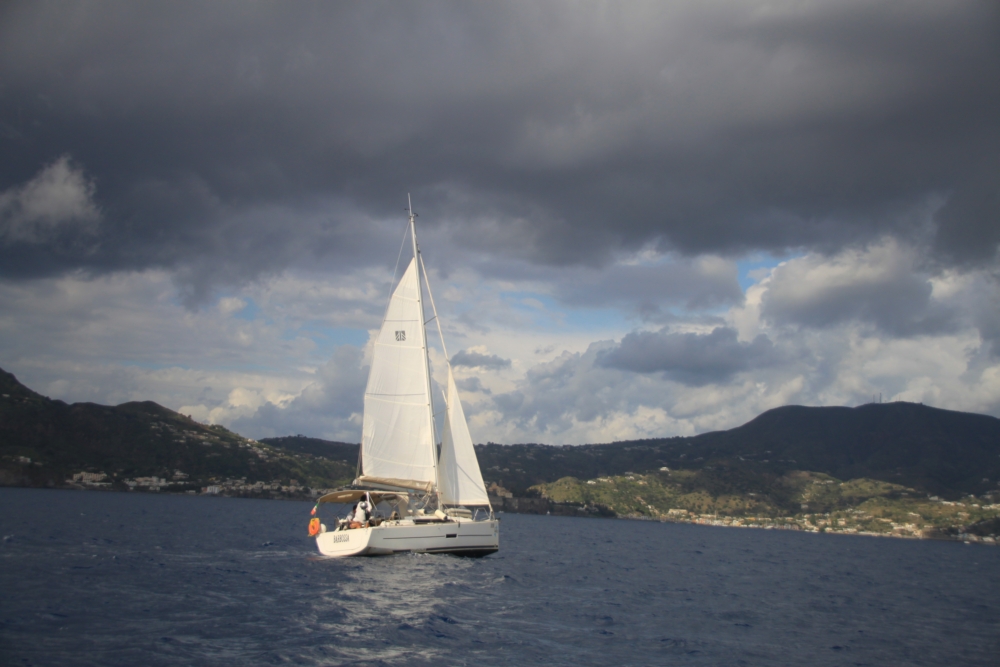 А после пошли на остров Липари в марину. Идти туда было 30 миль, при медленной яхте и довольно сложных условиях это заняло 7 часов. Сразу были зарифлены все паруса, грот на вторых рифах, стаксель подкручен. Рук было много, поэтому галсовались впятером, рулевой и четверо матросов — по одному на каждую лебедку. Особенно внимательно на сильном ветру надо было ловить гика-шкот при смене галса. Укачивало, если спускаться вниз, волны были метра по 4, ветер 25-30 узлов. Но виды красивые, яхты вокруг ходят и вообще отличная практика.