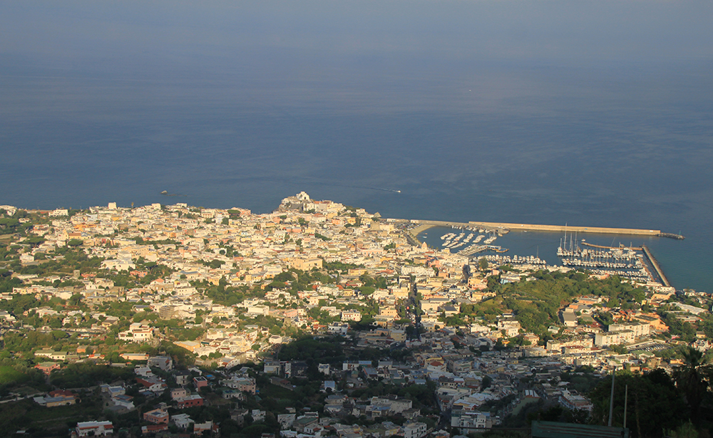 Вид на Форио сверху. Башня, по которой весь городок назван, слева от марины.