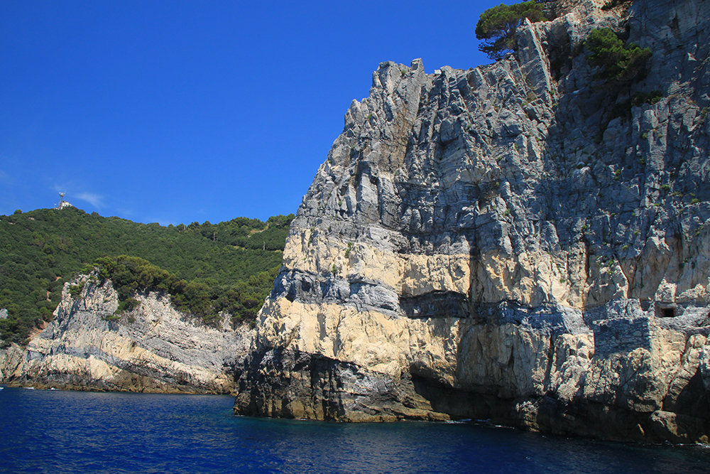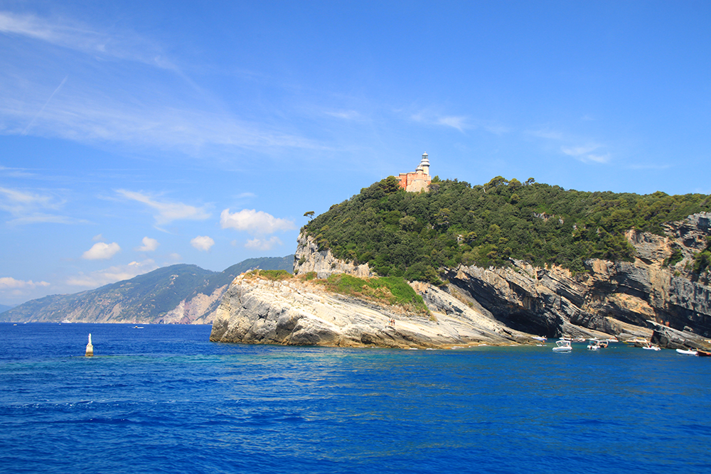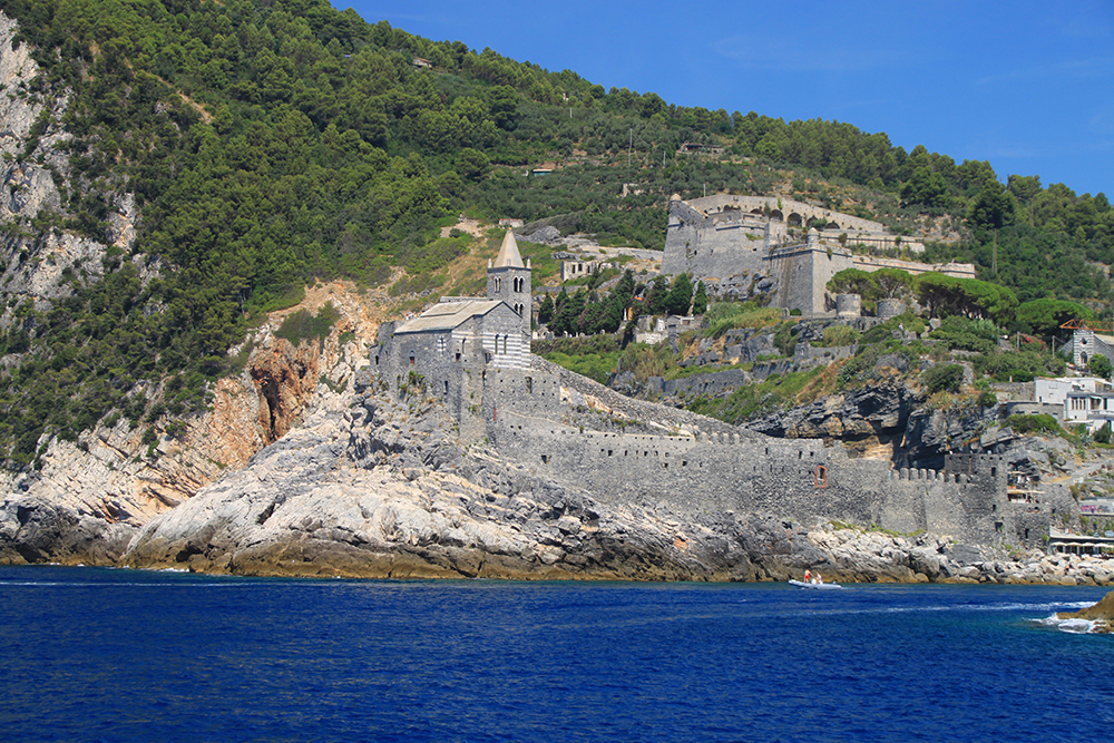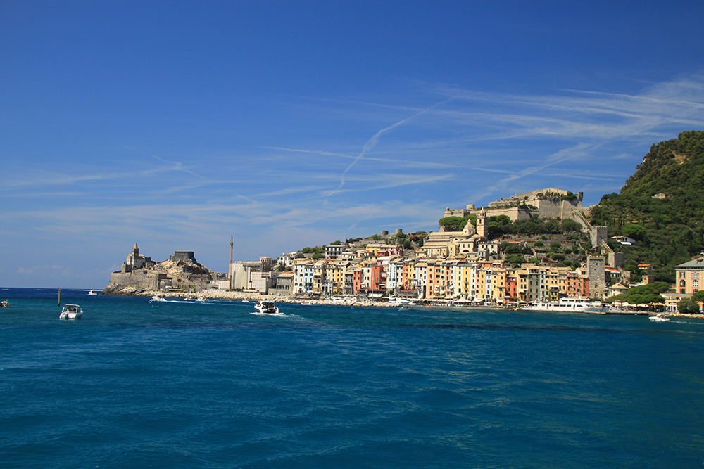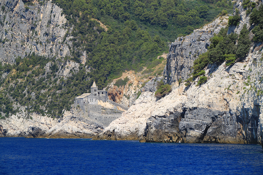 На четвертый день мы решили не ходить больше по жаре, стало тяжеловато. Поэтому мы снова доехали до Портовенере, сели на кораблик с экскурсией вокруг трех островов. Экскурсия стоит 15 евро, отправляется каждый час, продолжительность 45-50 минут. Виды замечательные. Портовенере с воды.