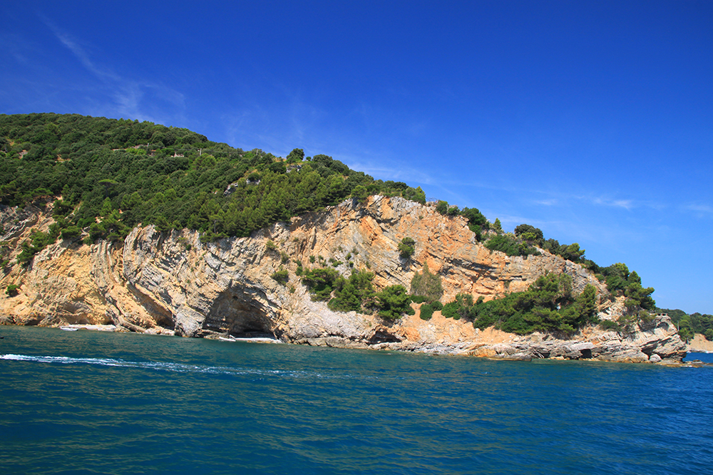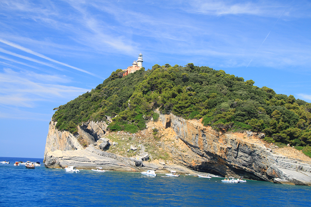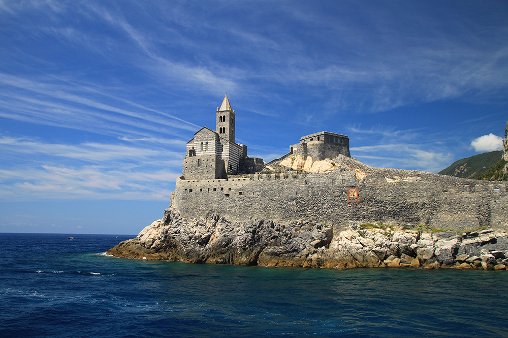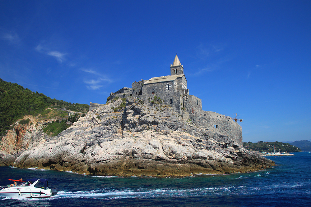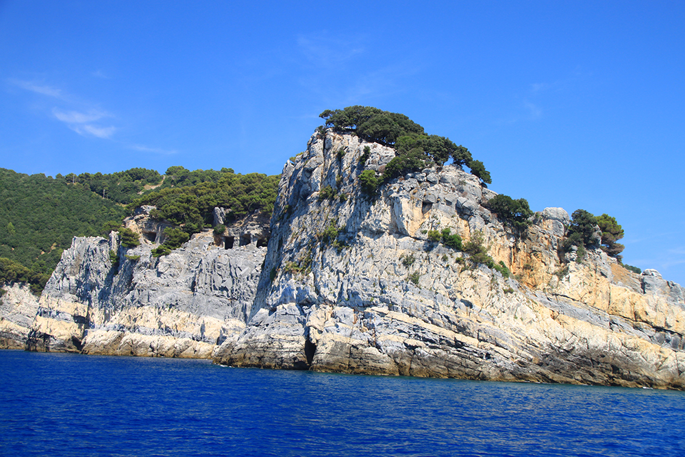На четвертый день мы решили не ходить больше по жаре, стало тяжеловато. Поэтому мы снова доехали до Портовенере, сели на кораблик с экскурсией вокруг трех островов. Экскурсия стоит 15 евро, отправляется каждый час, продолжительность 45-50 минут. Виды замечательные. Портовенере с воды.