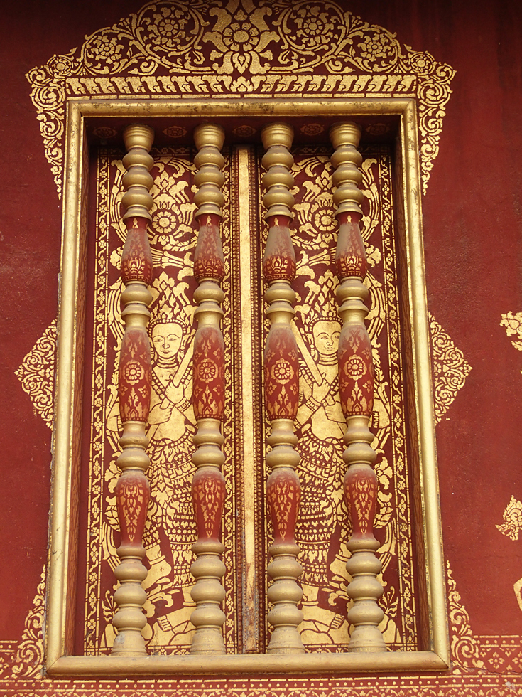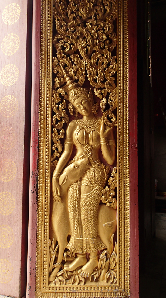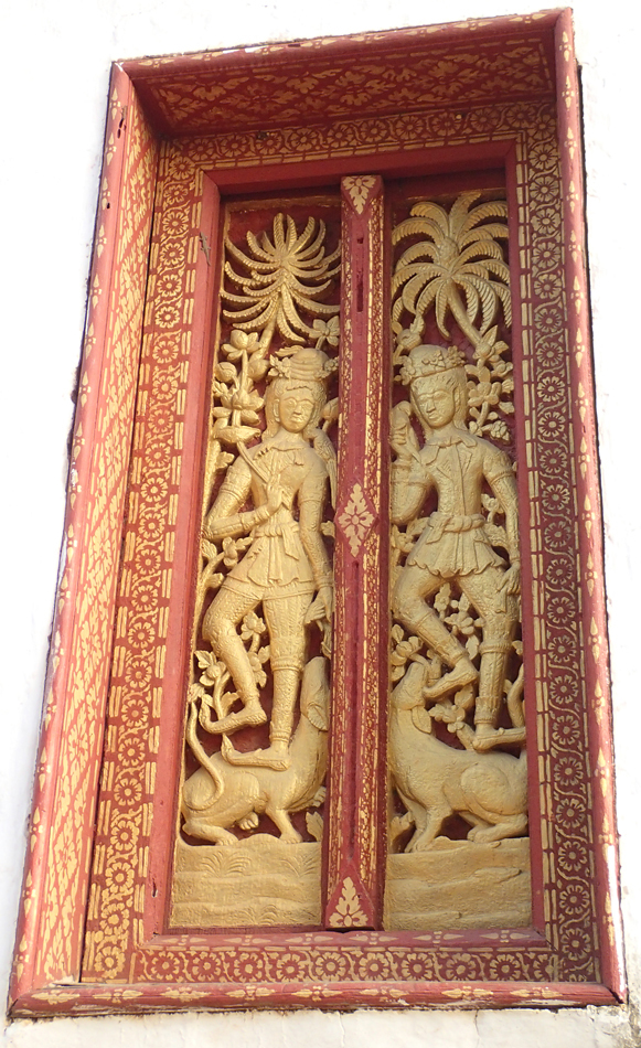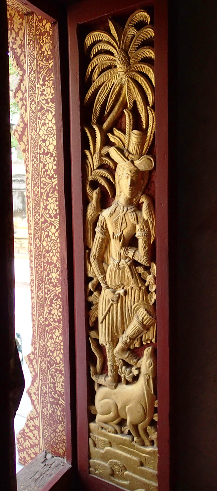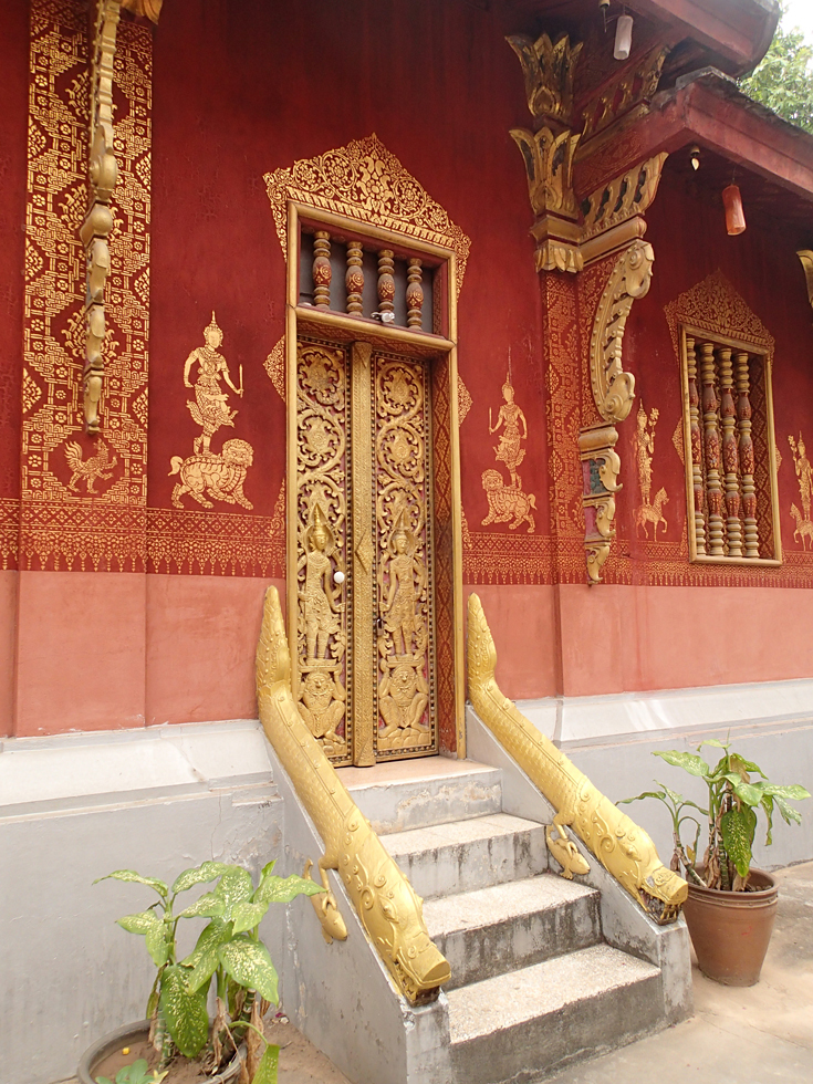 В городе немало храмов, есть забавные детали. Ват Пакхе, на резных дверях вместо апсар и других мифологических существ изображены... европейцы.