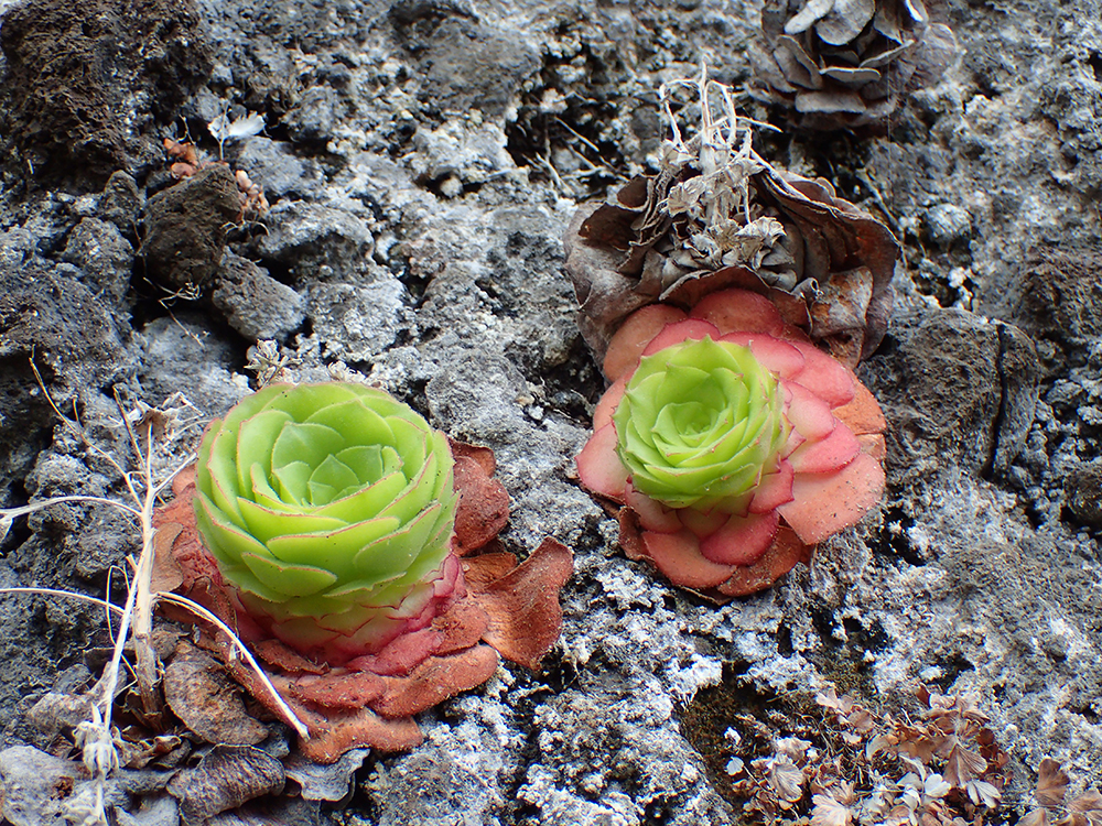 На камнях растут каменные розы. Вот такие они в дикой природе, никаких стеблей.