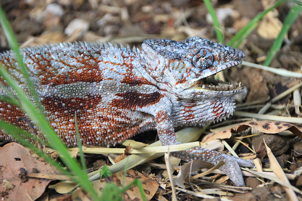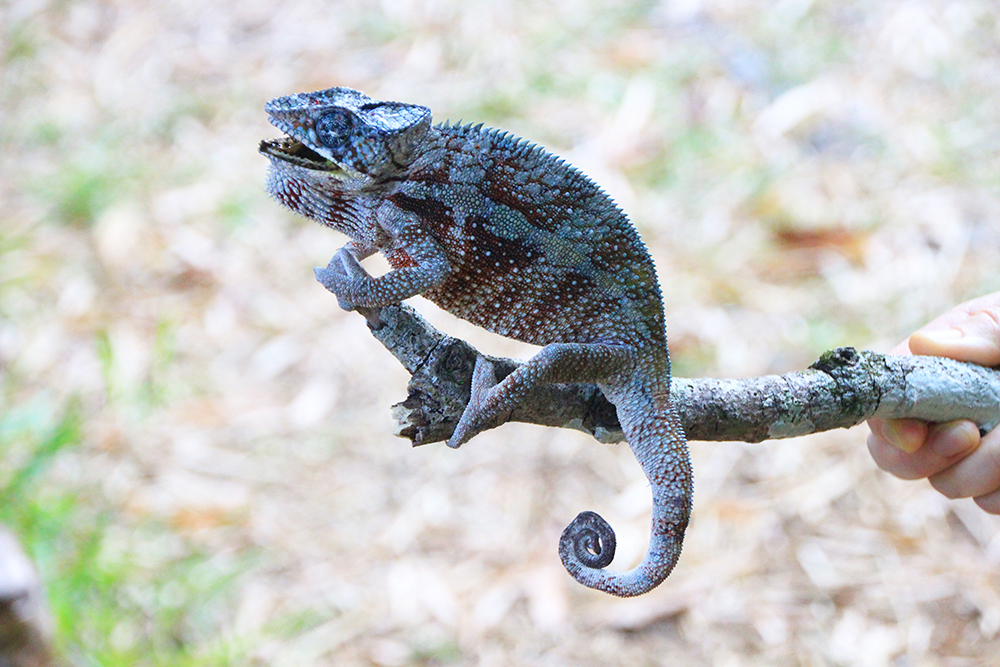 Хамелеона отбили у птицы, хорошенько рассмотрели и отнесли в ближайшие кусты.