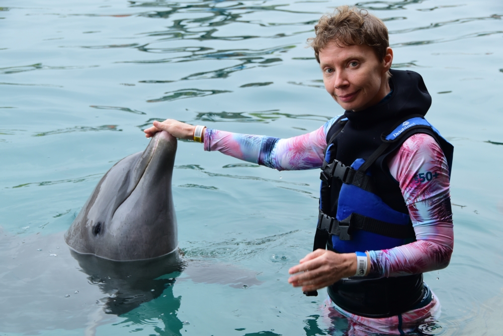 А Тиночка удерживается, чтобы не заверещать от восторга. А то ведь можно и дельфина напугать.