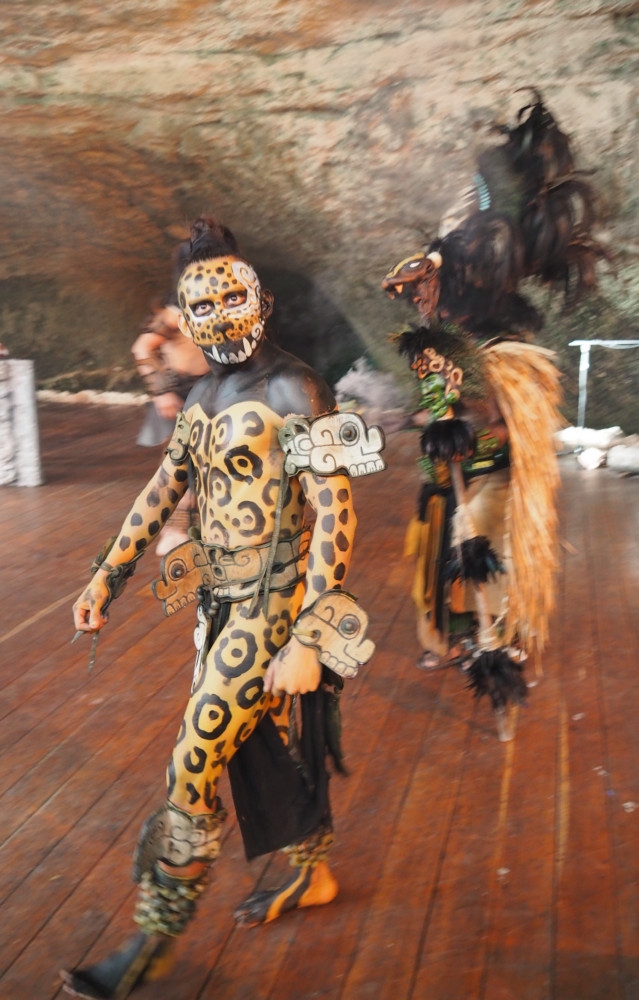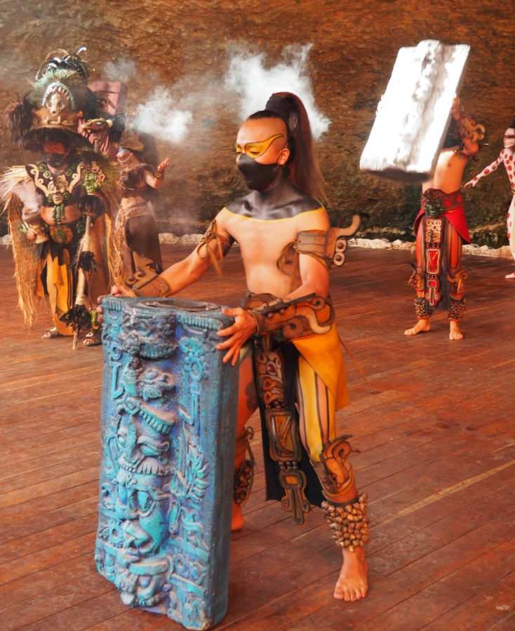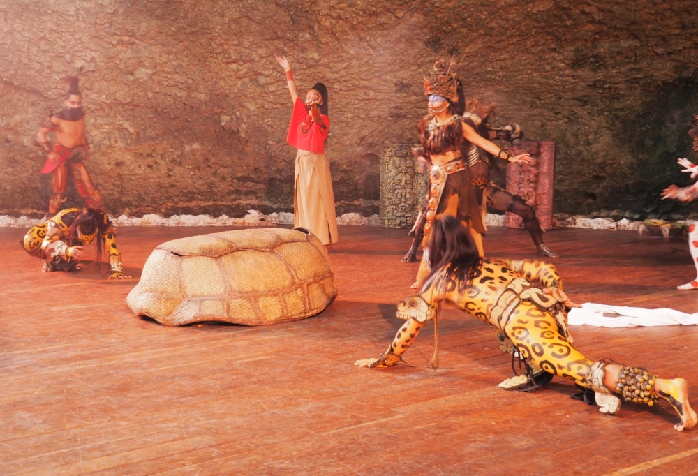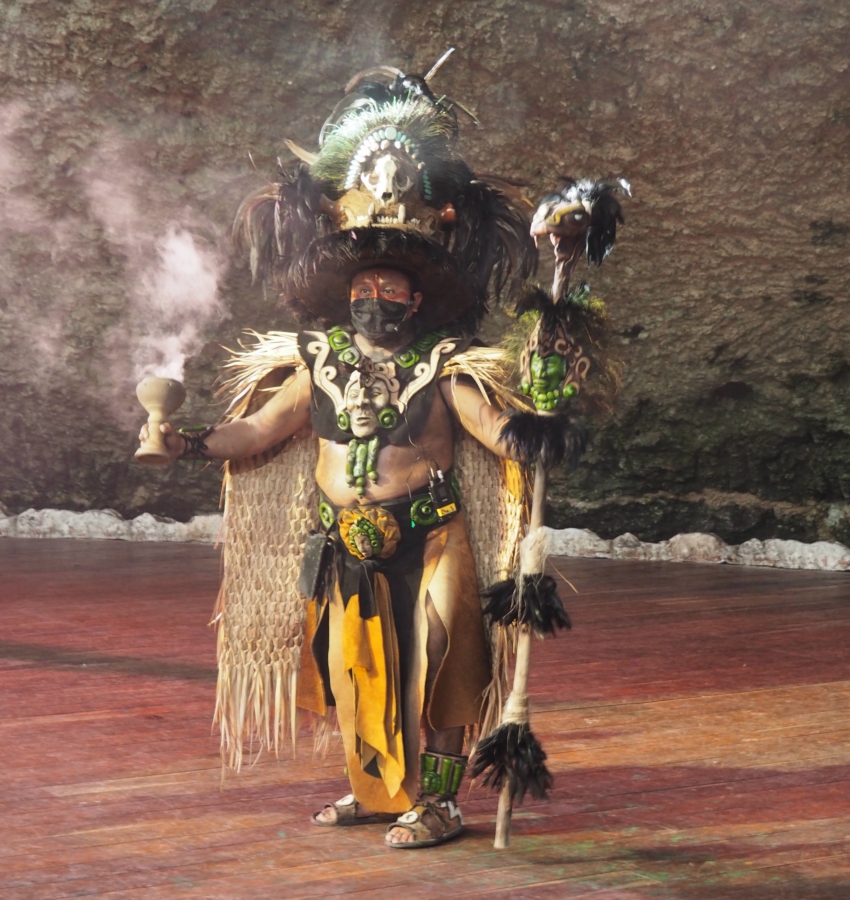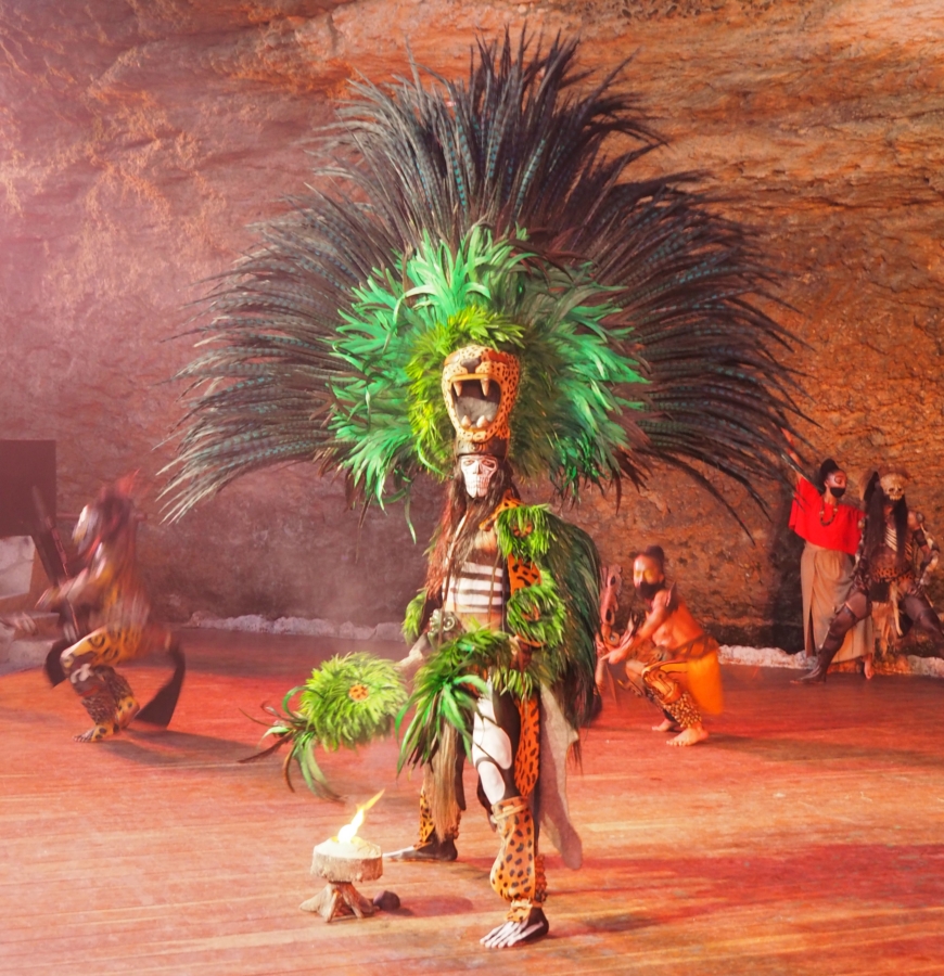Мы уже потом почитали на сайте парка, что творилось на сцене. Основная идея — рождение кукурузы — была и так понятна. Если в двух словах, то с помощью танца нам рассказали о путешествии бога маиса Хун Нал Йе в подземный мир (Шибальбу) в сопровождении бога смерти Ах Пуч и божественных близнецов-героев Хунахпху и Шбаламке. Множество жрецов и потусторонних существ участвуют, чтобы выросла свежая и новая кукуруза. Зажигательные танцы происходят под живую музыку — духовые, ударные и просто боевые выкрики оркестра майя.