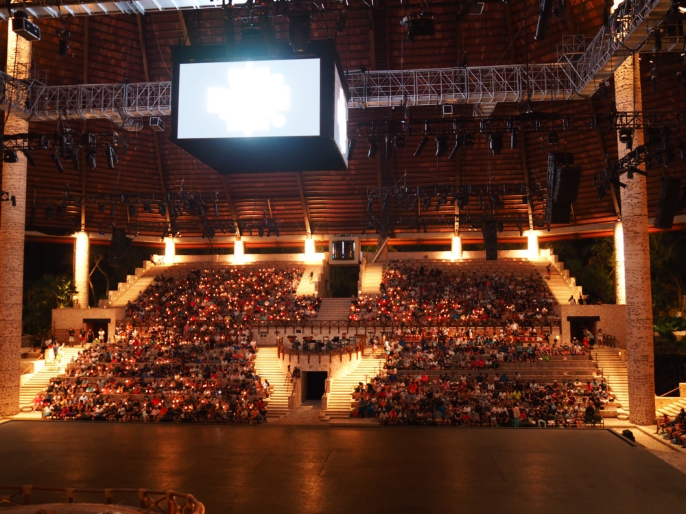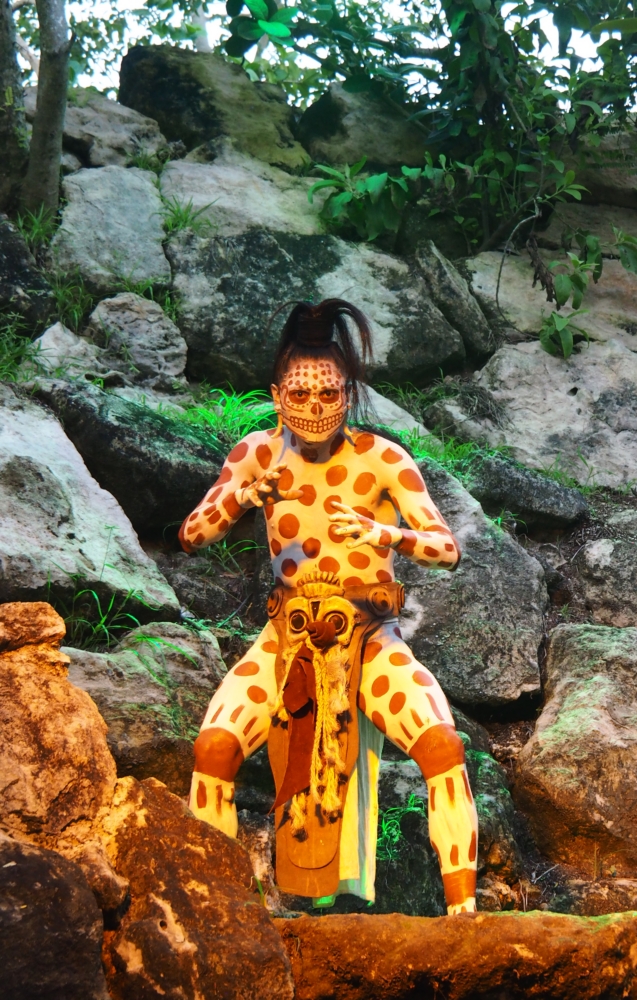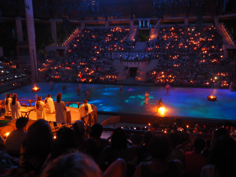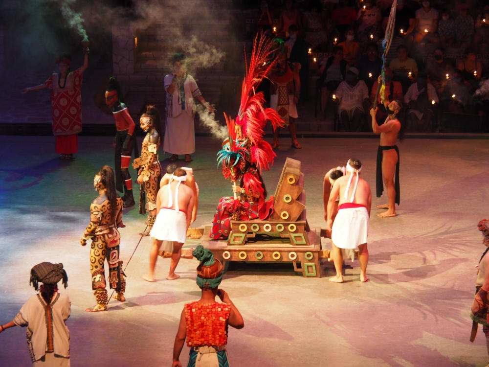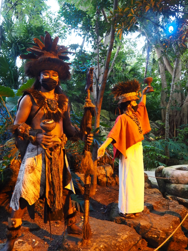 Мы уже потом почитали на сайте парка, что творилось на сцене. Основная идея — рождение кукурузы — была и так понятна. Если в двух словах, то с помощью танца нам рассказали о путешествии бога маиса Хун Нал Йе в подземный мир (Шибальбу) в сопровождении бога смерти Ах Пуч и божественных близнецов-героев Хунахпху и Шбаламке. Множество жрецов и потусторонних существ участвуют, чтобы выросла свежая и новая кукуруза. Зажигательные танцы происходят под живую музыку — духовые, ударные и просто боевые выкрики оркестра майя.