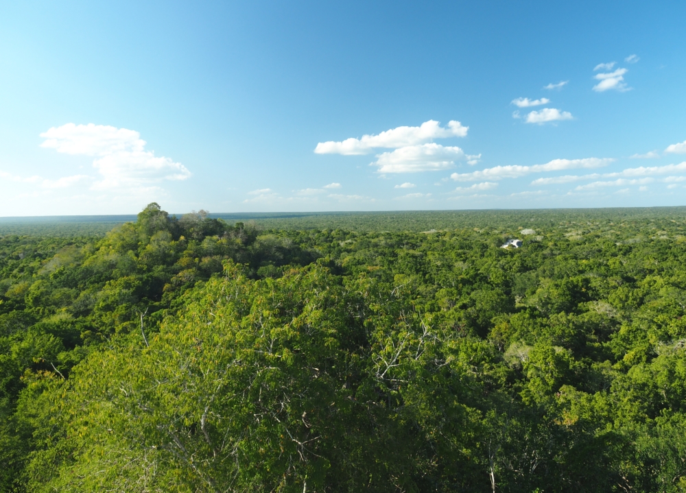 Калакмуль был большим городом, в нем жили несколько десятков тысяч человек. В лесных джунглях сейчас скрывается больше шести тысяч зданий, в основном они не раскопаны. Но для неискушенного посетителя город выглядит так: посреди бескрайнего леса стоят три офигительные пирамиды, одна двойная и одна в сторонке. Ну и несколько небольших зданий где-то там в деревьях теряются.