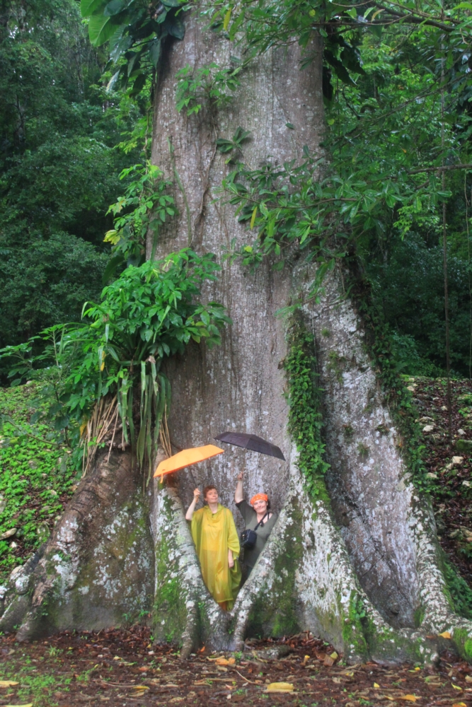 Попадаются роскошные деревья. Мы тут среди них в дождевиках и с зонтиками.