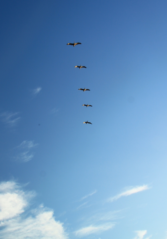 На закате дошли до набережной с пеликанами. Они летали над нам боевыми звеньями.