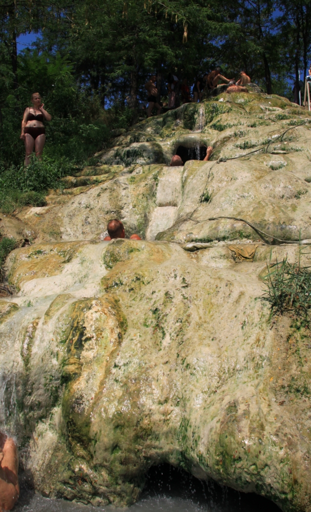 На пригорке образовался небольшой каскад травертиновых террас, по которым течет горячая сероводородная минеральная вода. Всего семь этажей, ванны небольшие, 1-2 человека влезает в каждую.