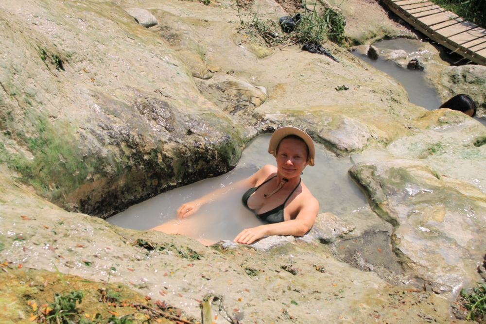 Местные власти очень хотят прикрыть это все великолепие: развесили таблички, что бактериальный фон повышен и не надо тут купаться. Но еще в 19 веке, когда господа принимали ванны в специально построенных помещениях, их слуги тут мылись и стирались, поэтому место традиционное. Отсюда и название. Справедливости ради надо сказать, что любые порезы и царапины действительно плохо совместимы с этой водой, мы проверили. Но если кожа без повреждений — то все хорошо. А, да: на травертине очень скользко, ходить надо супер-аккуратно.