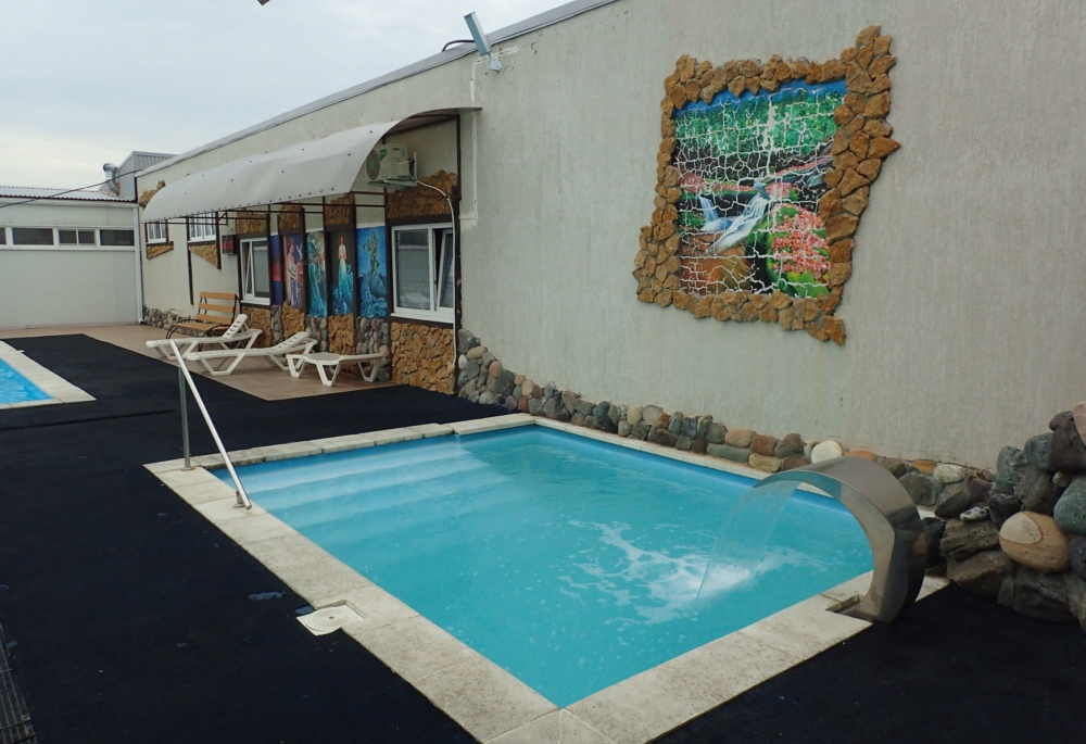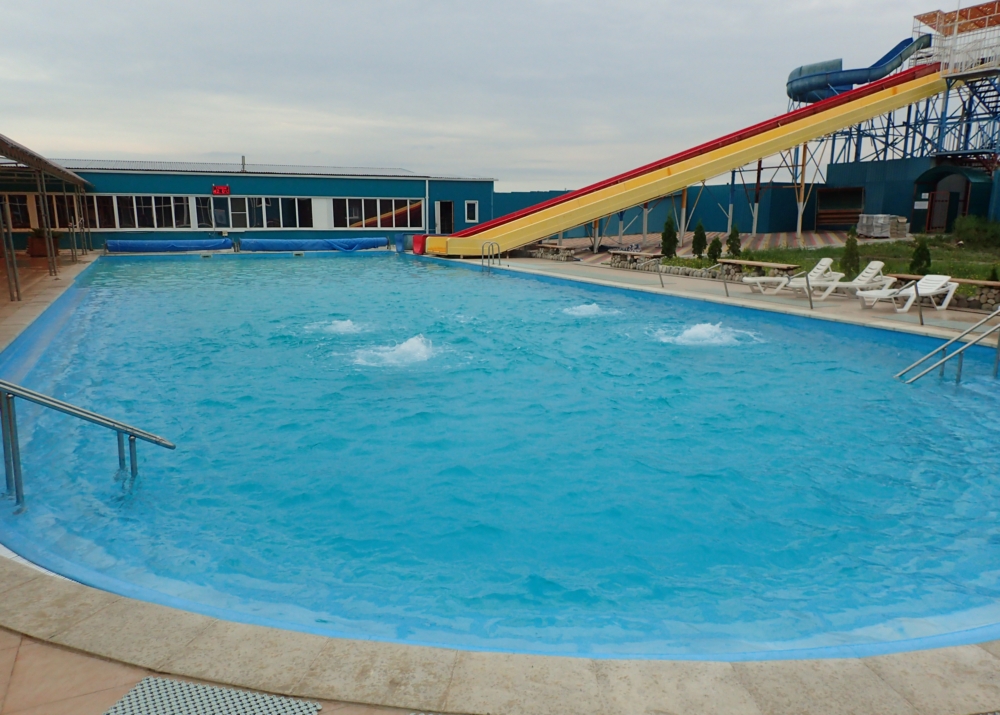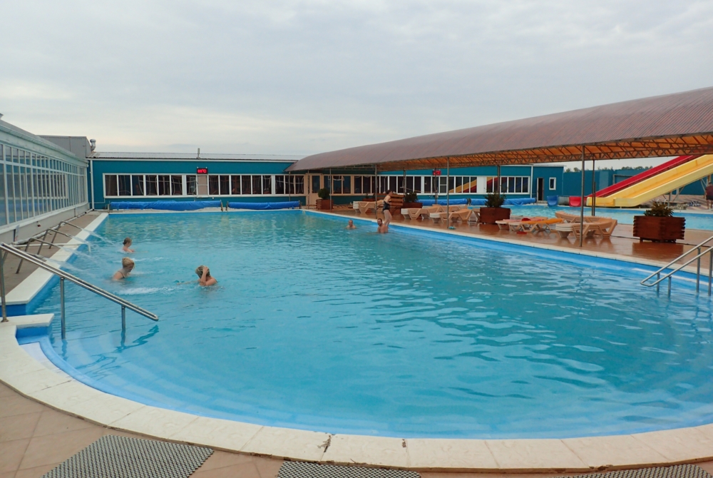 В станице Суворовская два термальных комплекса, находятся они рядом. Есть старый поменьше с синими крышами, есть новый побольше, справа от старого. Цены совершенно одинаковы — 450 рублей в час, причем это честный час в бассейнах, раздевалка не считается. Мы пошли в тот комплекс, который с синими крышами, там почему-то народу меньше.