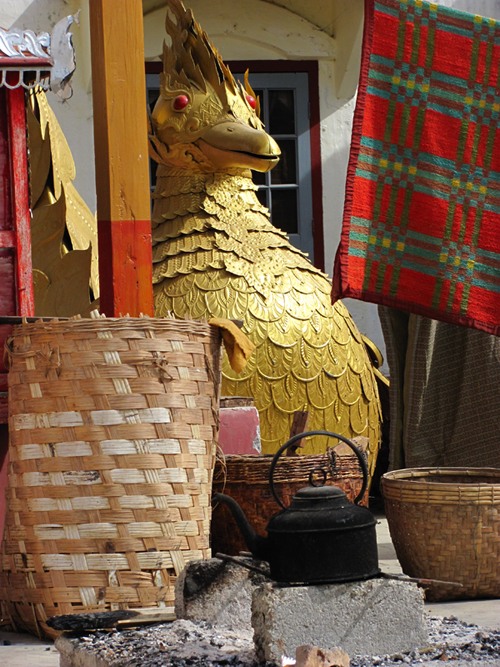 В храме помимо прочего есть ряд музейных экспонатов, некоторые действительно интересные. Еще нас поразила золотая утка во дворе. Она уютно спряталась за чайником, почти завернувшись в плед.